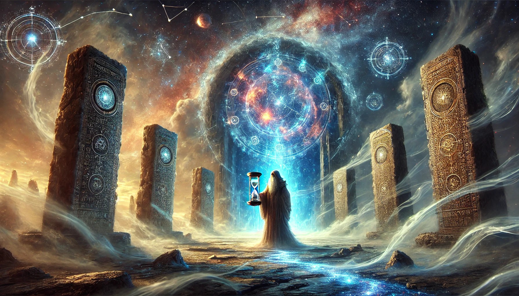 This illustration portrays a powerful moment in a high fantasy setting, where fate itself is being unveiled. At the center, a celestial oracle stands before an ancient cosmic portal, its swirling constellations and glowing ethereal symbols radiating with destiny’s energy. The oracle, draped in shimmering robes that seem woven from the fabric of the stars, holds a radiant hourglass filled with stardust—its grains slowly shifting, symbolizing the passage of time and fate.