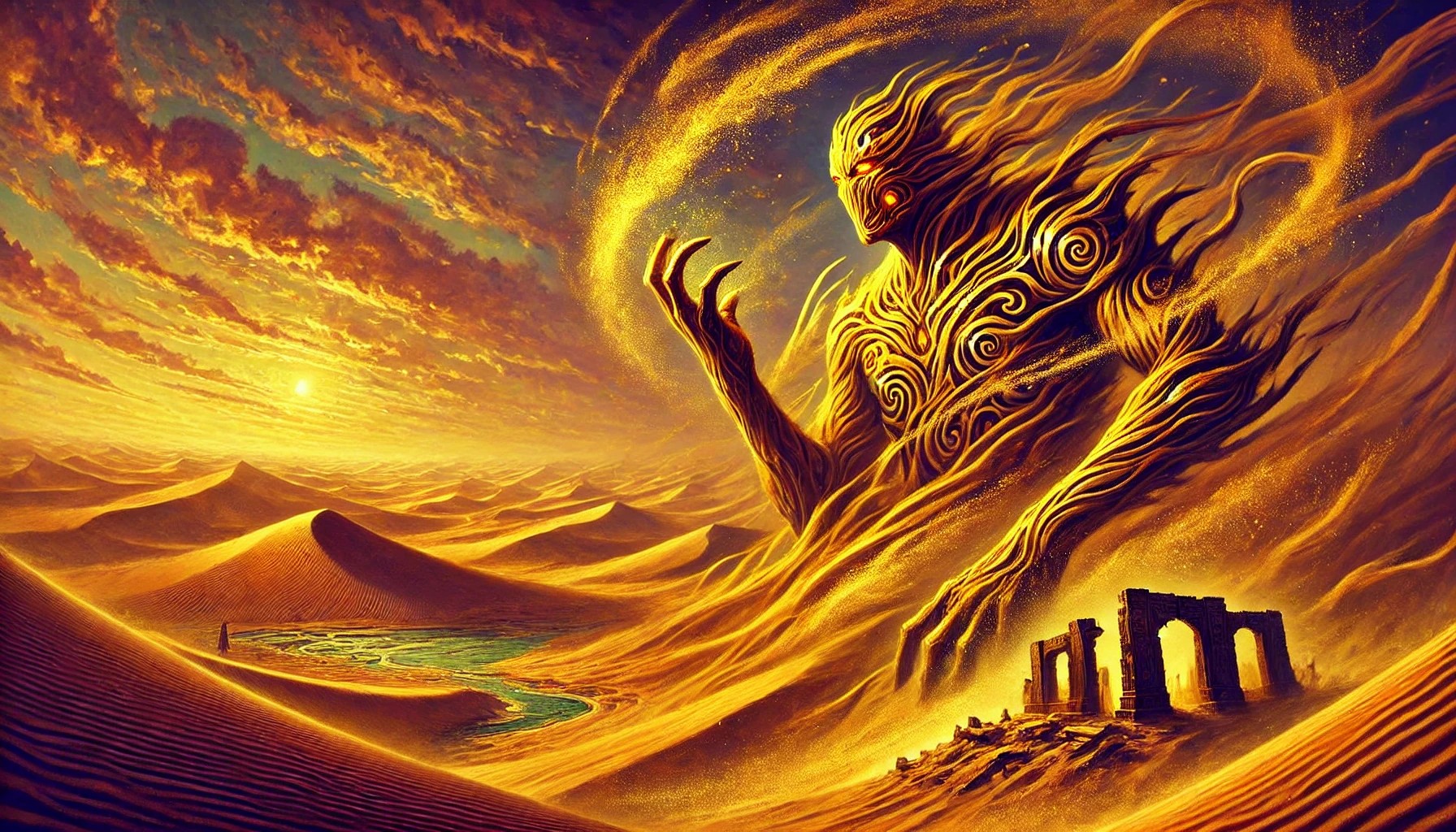 This illustration depicts a towering sand elemental emerging from a vast desert landscape. Its massive body is composed of swirling golden sand, shifting and flowing like living dunes. Glowing amber eyes pierce through the dust, and intricate patterns ripple across its form, hinting at ancient magic. As the elemental moves, its enormous hands summon gusts of wind, creating a storm of drifting sand and dust that fills the air.