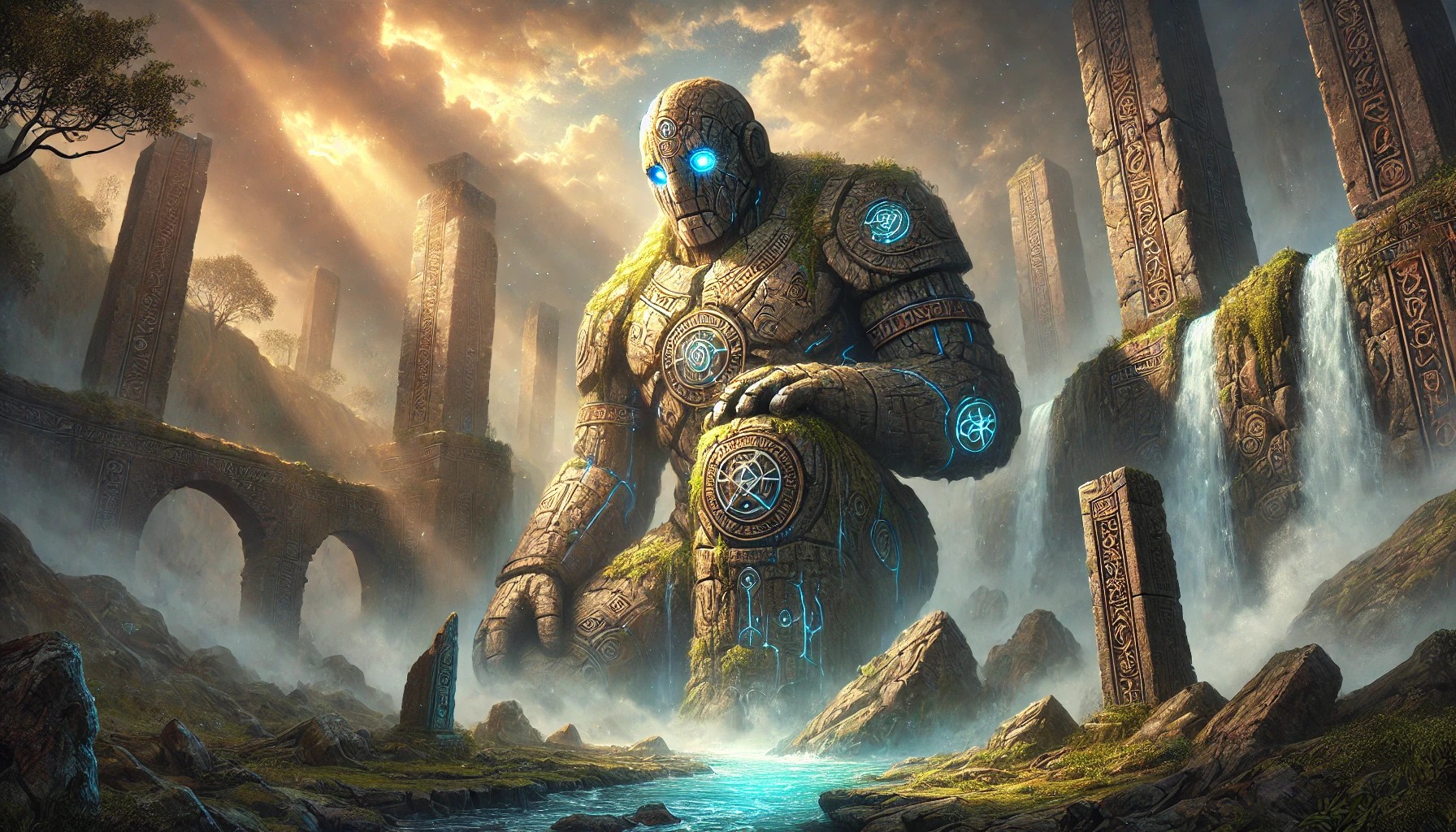 This fantasy illustration depicts a colossal stone guardian standing amidst the ruins of an ancient temple in a misty valley. The golem is intricately carved from weathered stone, with glowing runes pulsating across its massive form. Moss and vines have overtaken parts of its body, emphasizing its age and connection to nature.