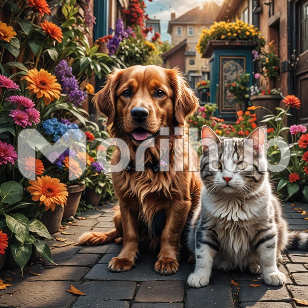 In a lively, sun-drenched park, a dog and a cat strike an unexpected friendship as they sit side by side. The dog, a golden retriever, exudes warmth with its soft fur glistening under the sun. Beside it, a sleek black cat, eyes gleaming with curiosity, relaxes comfortably. Surrounding them, colorful flowers bloom in vivid hues of red, yellow, and blue, and the grass beneath them is lush and green. People strolling by can’t help but stop and smile, charmed by this heartwarming scene of harmony between the two furry friends.