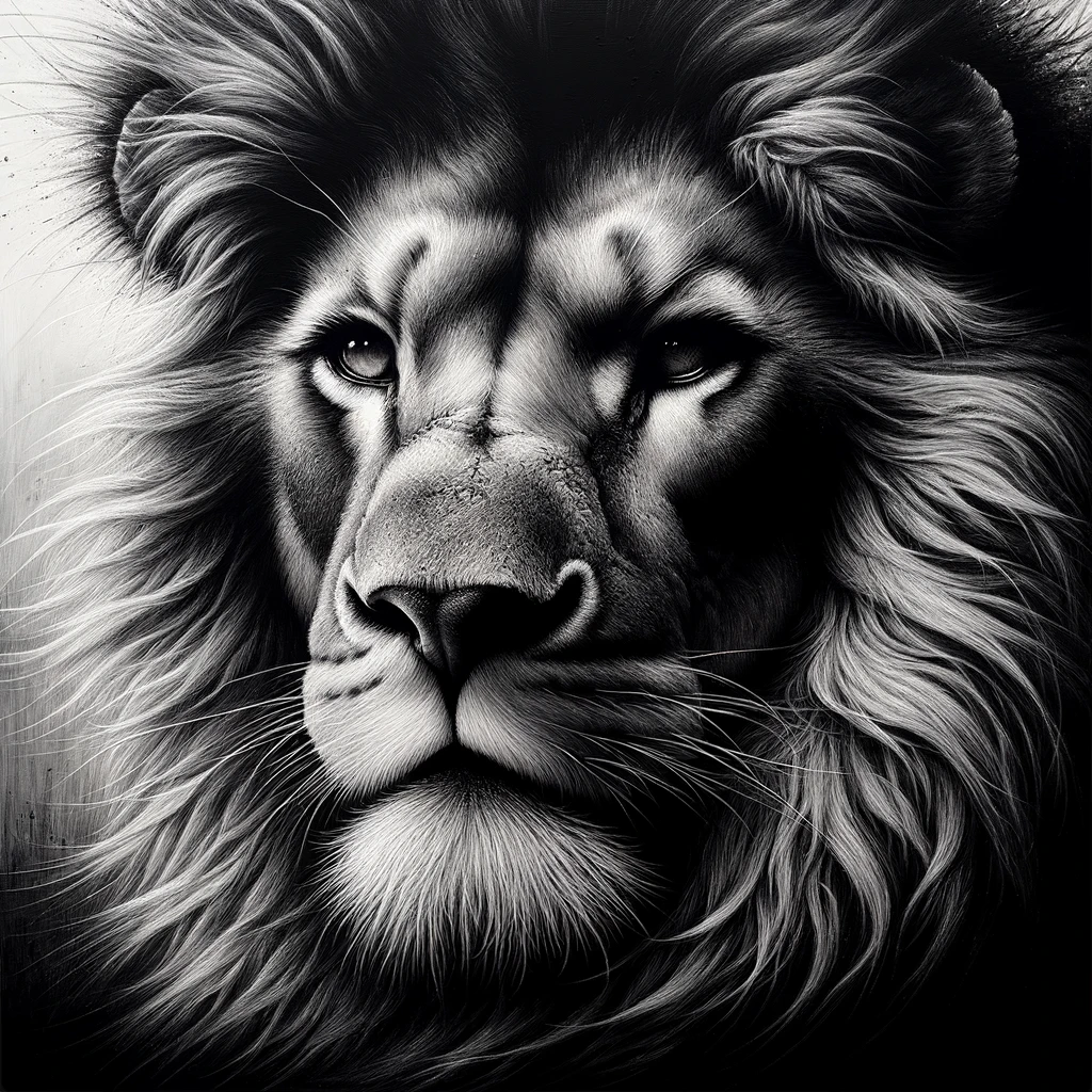 In this stunning black and white masterpiece, the majestic head of a lion commands attention. Every intricate detail and texture of its mane and facial features is meticulously captured, evoking a sense of awe and reverence. The play of light and shadow adds depth to the lion’s expression, highlighting its regal presence and untamed beauty.