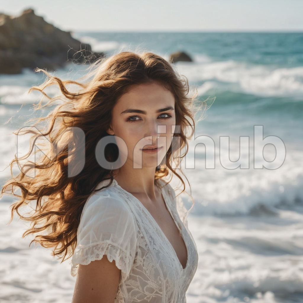 A vision of beauty stands with effortless grace, her hair billowing in the rhythmic dance of the wind. Behind her, the ocean roars with untamed majesty, mirroring the strength and serenity she exudes. The sunlight kisses her silhouette, creating an ethereal glow. In this poignant moment, the convergence of wind, waves, and the woman’s radiant presence forms a harmonious symphony of nature’s beauty, a timeless ode to the allure of the sea and feminine grace.