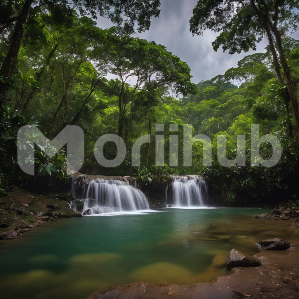 A babbling stream meanders through a verdant tapestry, embraced by lush greenery on its banks. The clear water reflects the vibrant hues of the surrounding foliage, mirroring the symphony of nature’s palette. Tall trees create a natural canopy overhead, casting dappled sunlight on the crystal-clear flow. The cloudless sky stands as a vast canvas, its cerulean expanse framing this idyllic scene, where the gentle murmur of the stream harmonizes with the tranquility of the open heavens.