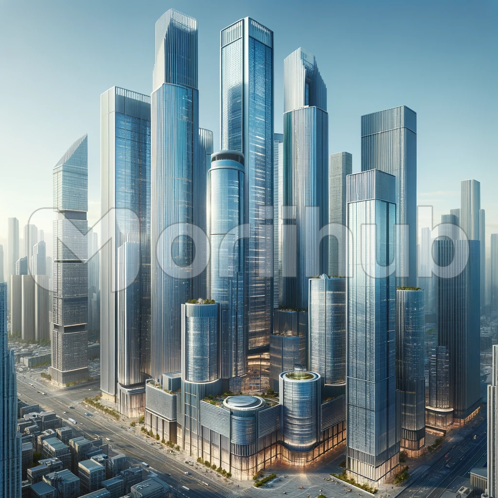 In this striking image, a cluster of futuristic skyscrapers stretches upward toward the heavens. These towering marvels of modern architecture boast sleek glass facades that glisten in the sunlight. Their design is a symphony of clean lines and reflective surfaces, projecting a vision of innovation and urban sophistication. These skyscrapers are a testament to the relentless pursuit of architectural excellence, standing as beacons of the future in a contemporary urban landscape.