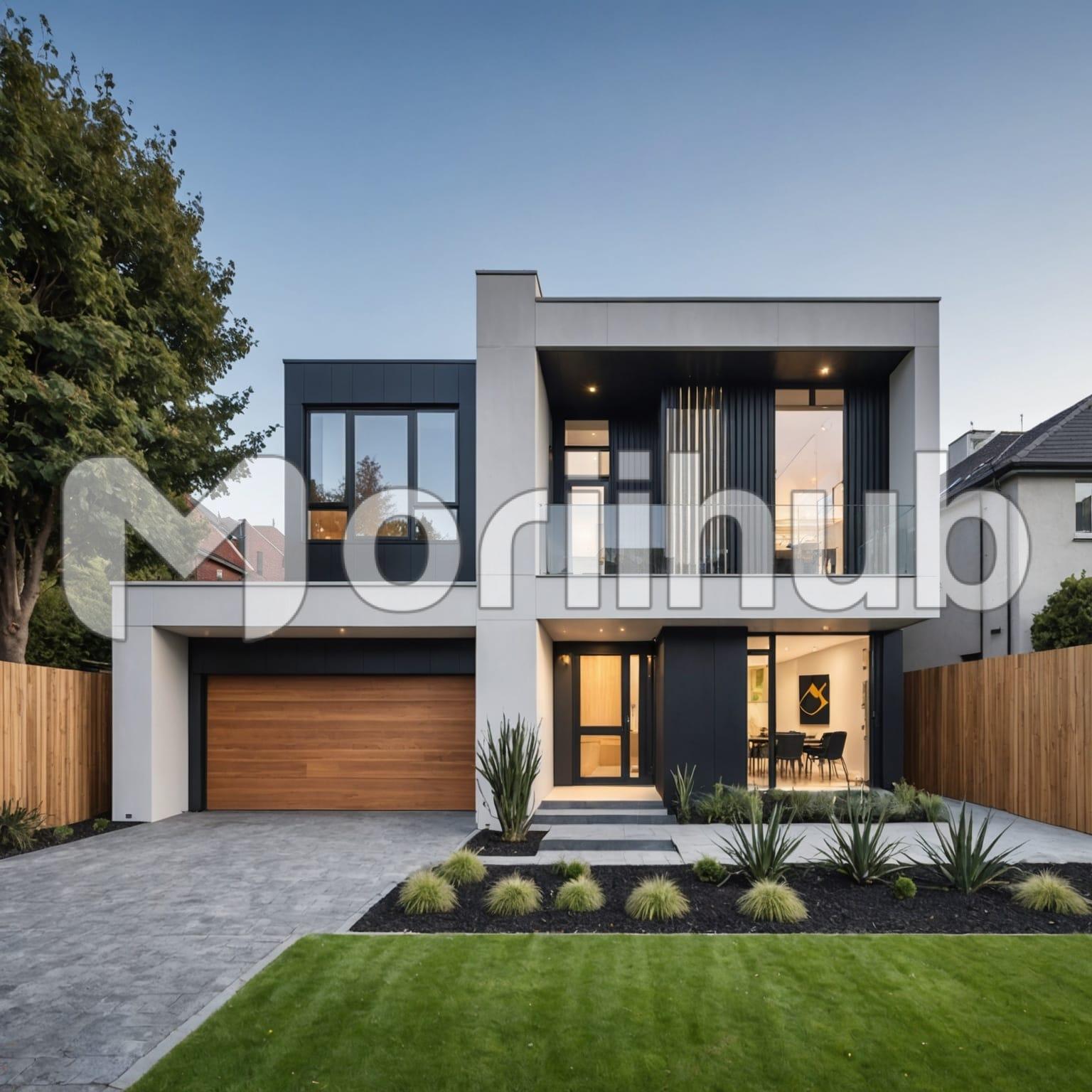 A sleek, modern house stands prominently against a backdrop of a clear sky. Its clean lines and minimalist design create a striking contrast with the expansive blue above. A tree sits in the corner of the property, its lush foliage adding a touch of nature to the contemporary setting. The house’s large windows reflect the sky’s clarity, enhancing its airy, open feel. The overall scene is one of harmonious simplicity, where modern architecture meets the serenity of a well-maintained landscape.