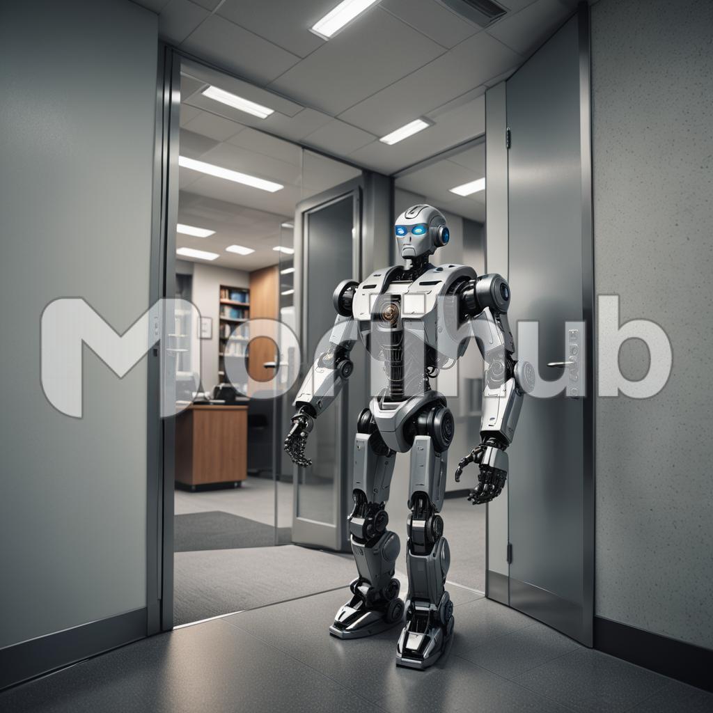 A robot stationed at an office door serves as a futuristic sentinel, blending technology with functionality. It stands poised, its sleek metallic frame reflecting the ambient light of the bustling workspace. Equipped with sensors and AI, it detects approaching individuals, greeting them with a friendly LED display or voice prompt. Its purpose ranges from security monitoring to guiding visitors with interactive maps or scheduling appointments seamlessly. The robot’s presence embodies the intersection of innovation and efficiency, offering a glimpse into the evolving landscape of automated assistance in modern workplaces.