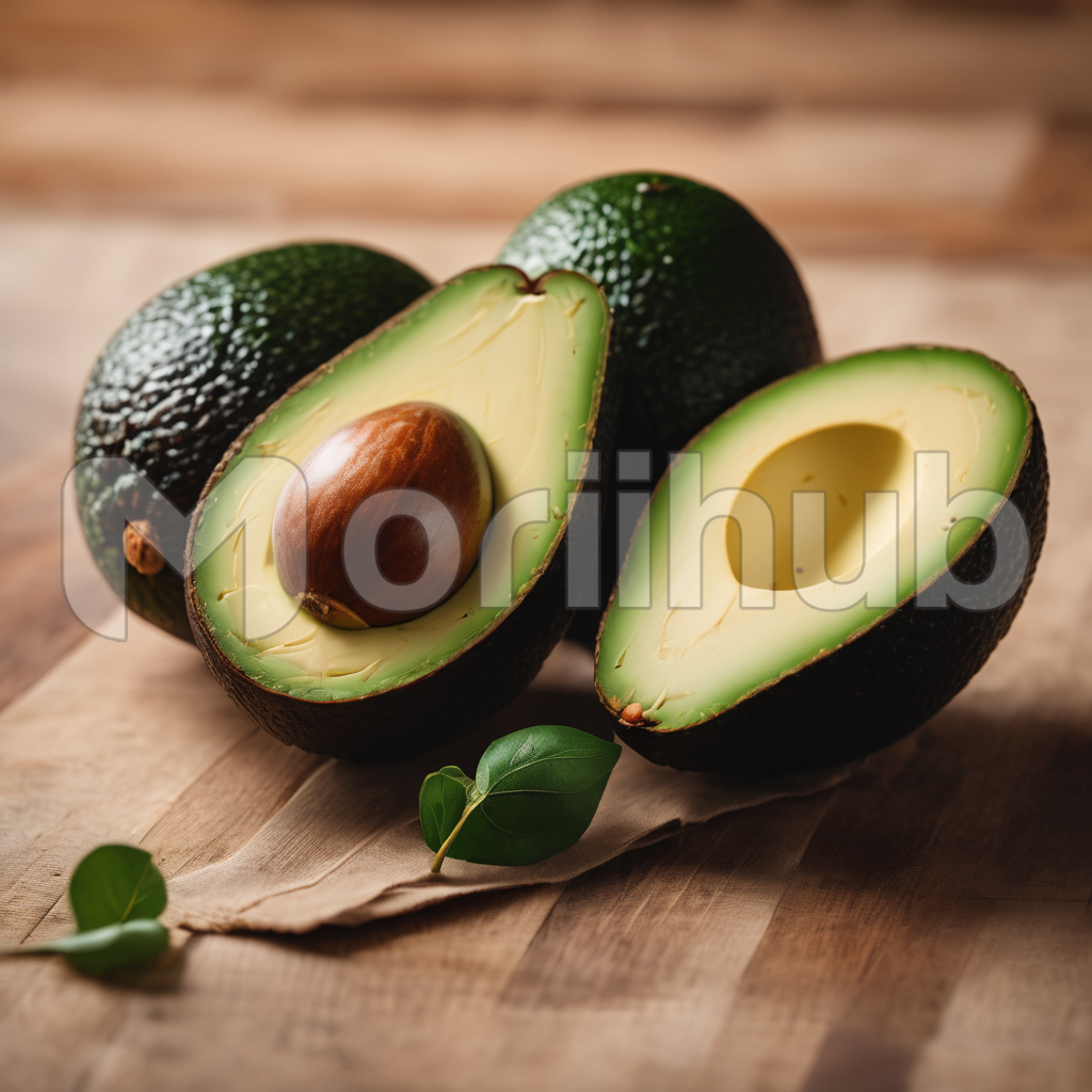 On a tabletop, an avocado takes center stage, its smooth green skin inviting exploration. Delicately sliced open, the vibrant, buttery flesh is revealed, an appetizing display of natural allure. Two whole avocados stand proudly in the background, promising culinary possibilities. The tableau captures the simplicity and richness of this versatile fruit, ready to be savored and transformed into a delectable feast, as the essence of wholesome freshness emanates from the scene.