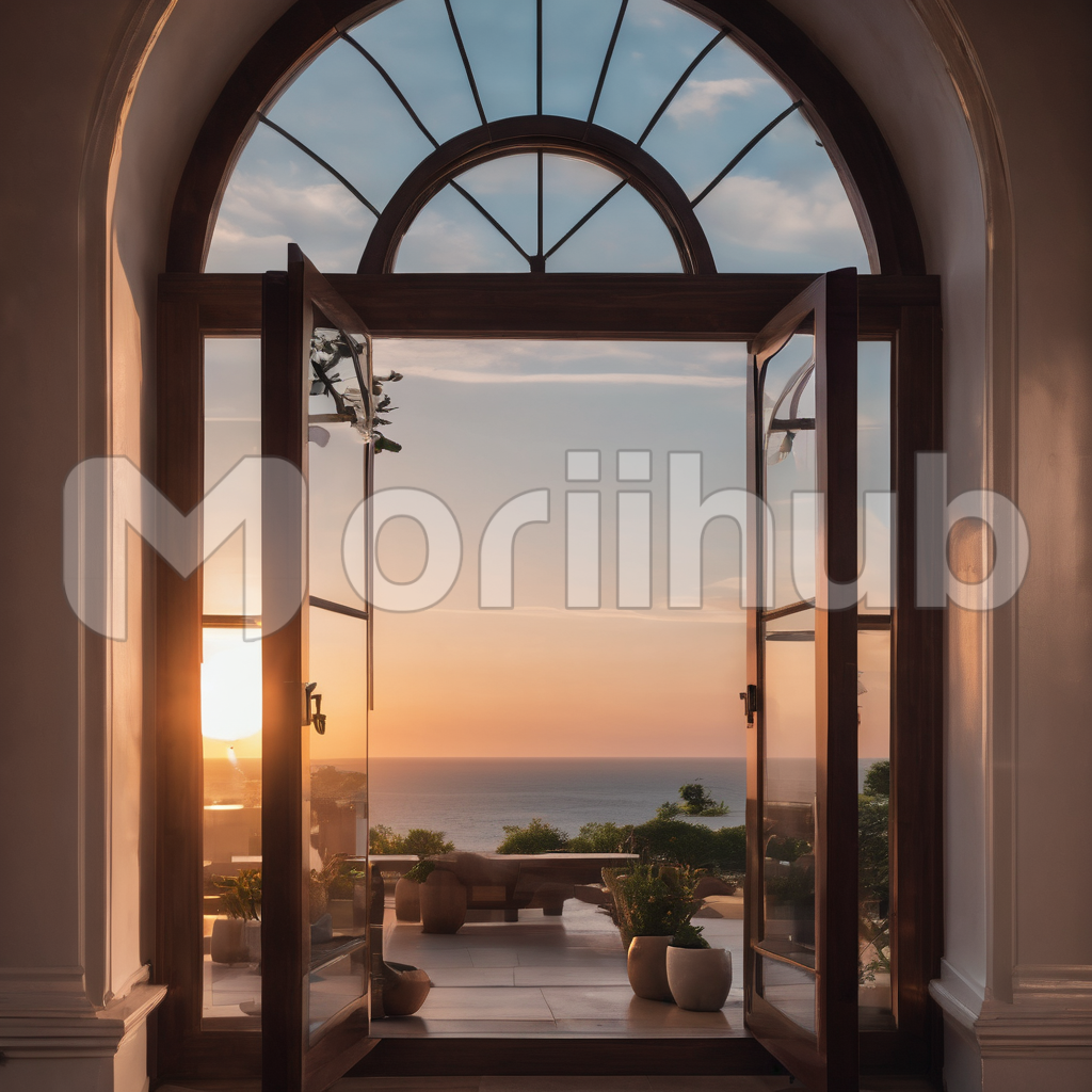 The sky transforms into a canvas of fiery hues as the sun dips below the horizon, casting a golden glow across the landscape. A glass door stands open, inviting the evening breeze to dance through the room. Beyond lies a balcony adorned with vibrant flowerpots, their blooms painted in the warm embrace of twilight. The scene is a symphony of colors and scents, a tranquil sanctuary where nature’s beauty embraces the soul.