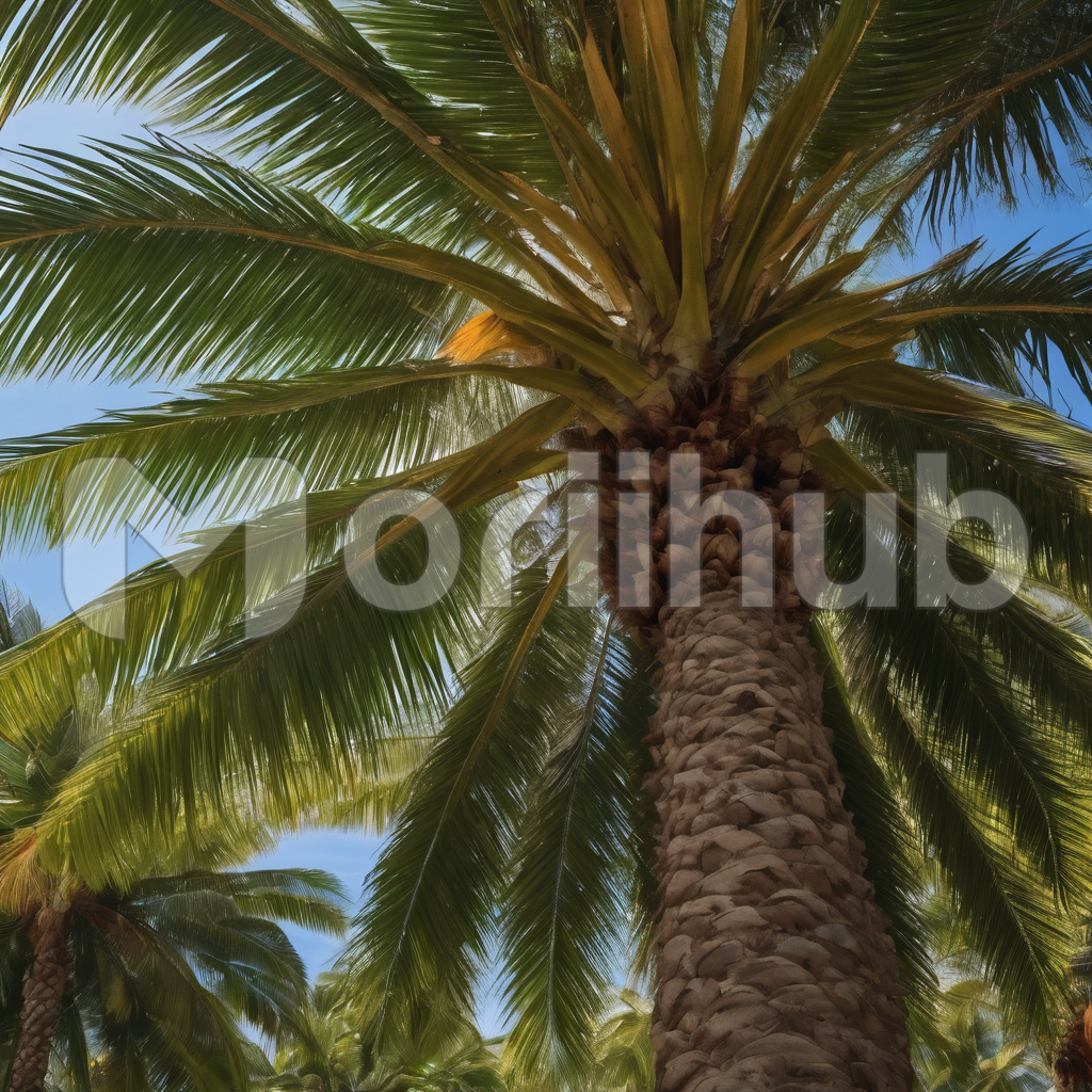 The palm tree, a symbol of tropical allure, stands tall against azure skies with a crown of gracefully swaying fronds. Bathed in golden sunlight, it casts dappled shadows on sandy shores. A testament to resilience, it whispers tales of ocean breezes, warm climates, and the tranquil beauty of paradisiacal landscapes.