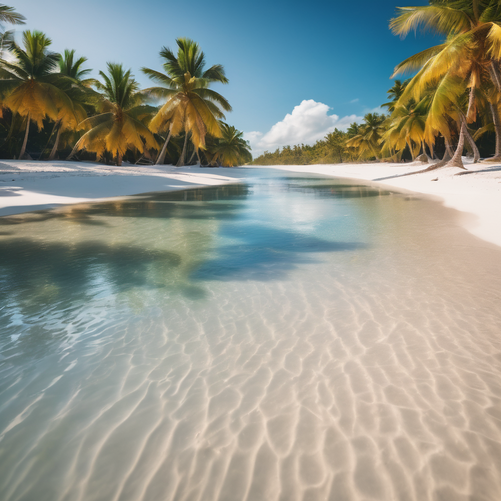 Along a pristine white sand beach, clear waters gently kiss the shore, shimmering in the sunlight. Towering palm trees line the coastline on either side, casting dappled shadows on the sand. The rhythmic sound of waves lapping against the shore fills the air, blending harmoniously with the rustle of palm fronds in the breeze. Here, amidst nature’s splendor, a tranquil oasis awaits, inviting relaxation and contemplation by the sea.