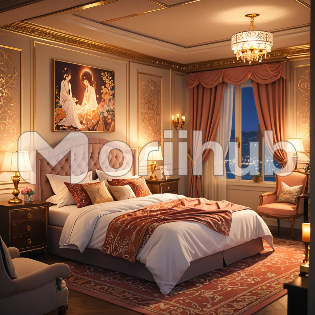Within the bedroom’s embrace, an aura of elegance and comfort prevails. An impeccably arranged bed stands as the focal point, adorned with plush pillows and soft linens, inviting restful repose. Art graces the walls, adding a touch of sophistication to the space, while lamps in the corners cast a warm, inviting glow. Nestled in a cozy corner, chairs offer a quiet retreat for contemplation. Drapes drawn shut provide privacy and intimacy, as a majestic chandelier overhead adds a touch of grandeur to the room’s serene ambiance.