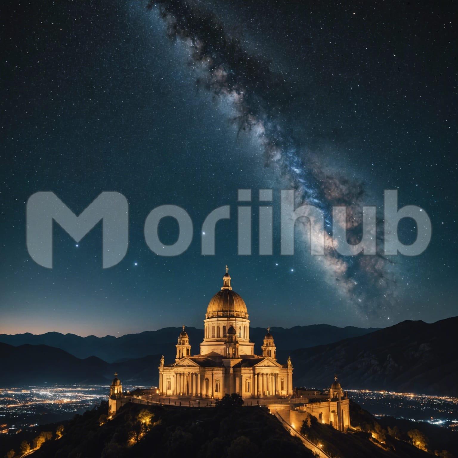Under a starry night sky, an imposing building stands in the distance, its silhouette outlined against the celestial expanse. Countless stars dot the darkness, twinkling with ethereal brilliance, as if echoing the lights within the distant structure. The cool night air carries a sense of quiet reverence, emphasizing the grandeur and solitude of the scene. Each star seems to tell a story, punctuating the vastness above and lending a timeless aura to the architectural presence below. This nocturnal tableau evokes a blend of awe and contemplation under the canopy of stars.
