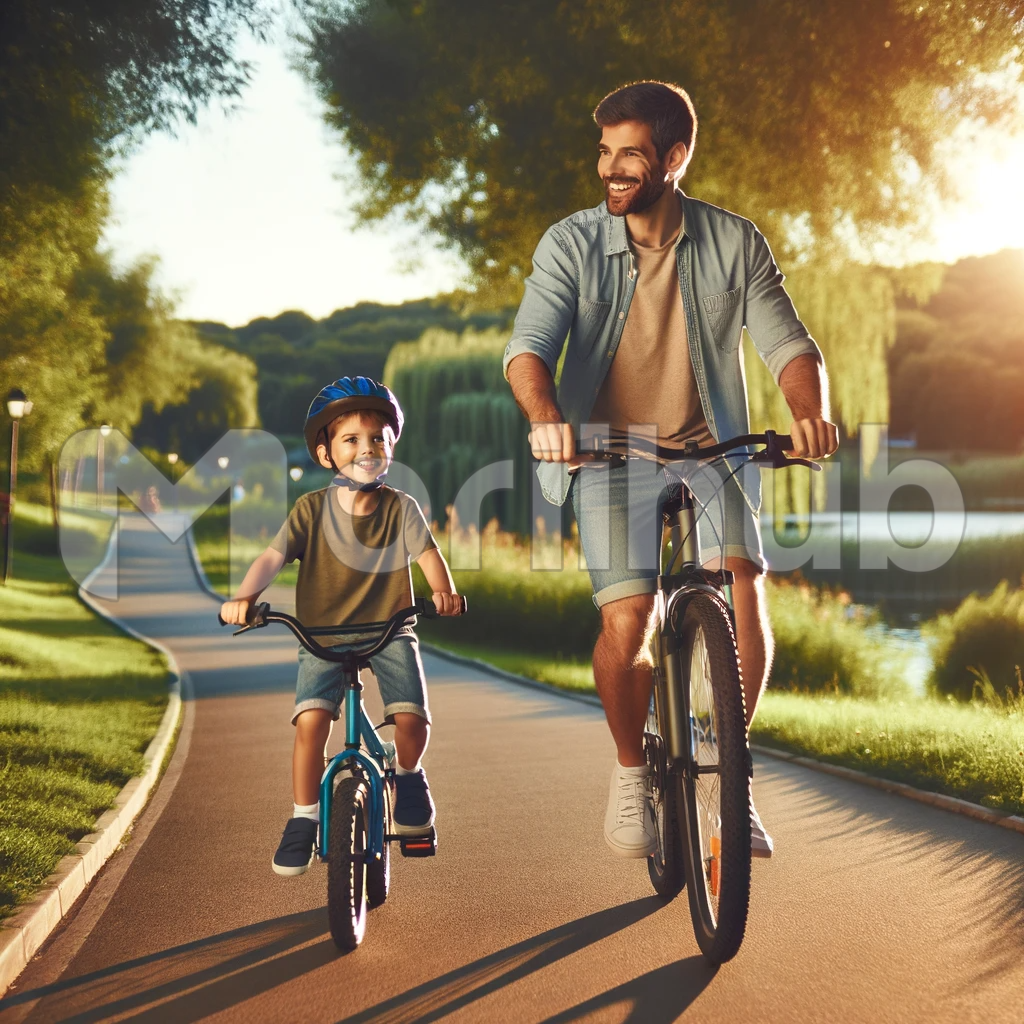 In this heartwarming scene, a father and his son share a beautiful moment on a bike ride. The father leads the way on his sturdy, full-sized bicycle, while the son, full of enthusiasm, pedals energetically on his smaller, child-sized bike beside him. Their smiles radiate joy, and the bond between them strengthens with each pedal stroke, creating a cherished memory of togetherness and adventure.