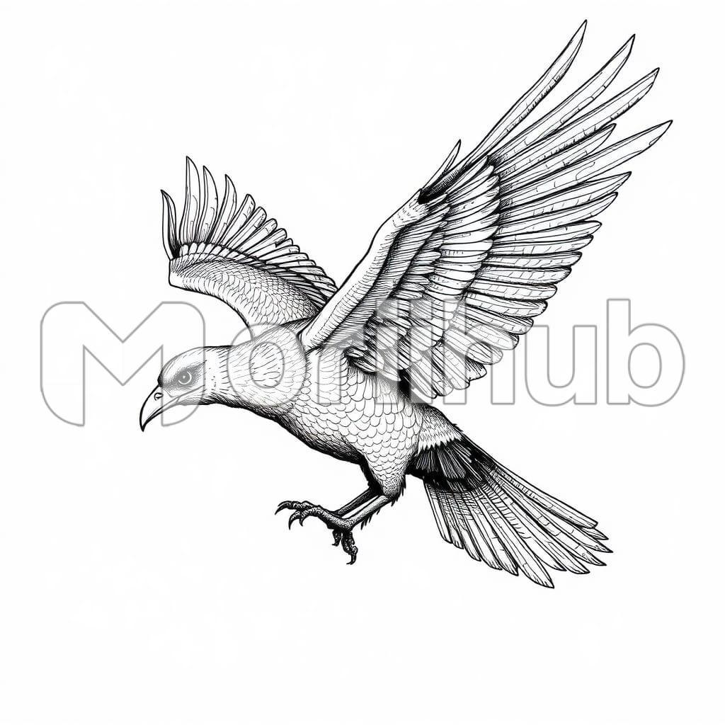 The sketch captures the dynamic pose of a bird in mid-flight, its wings outstretched with intricate detailing that suggests motion. The talons are extended forward, giving a sense of purposeful movement and natural grace. Each feather is drawn with fine lines, adding texture to the depiction, while the bird’s streamlined form exudes a sense of freedom and power. The plain background keeps the focus on the bird, allowing the viewer to appreciate the artistry in its form and the energy conveyed through the sketch’s fluid lines and shading.