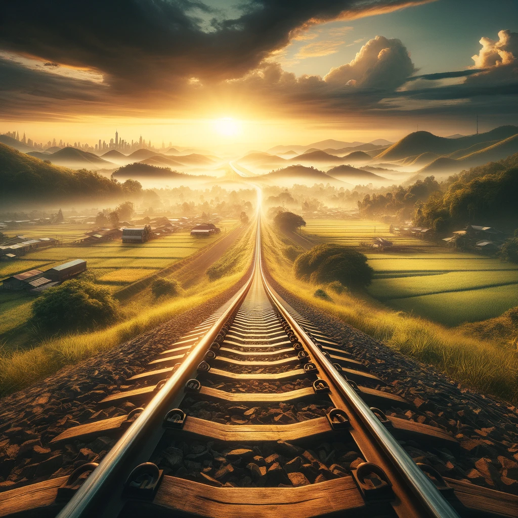 Behold a picturesque vista where the iron veins of civilization converge with the splendor of nature or urbanity. Train tracks, stretching into the distance, marry the precision of human engineering with the organic or structured beauty of the landscape. A harmonious blend of man-made ingenuity and natural or urban grandeur unfolds, inviting contemplation and awe.
