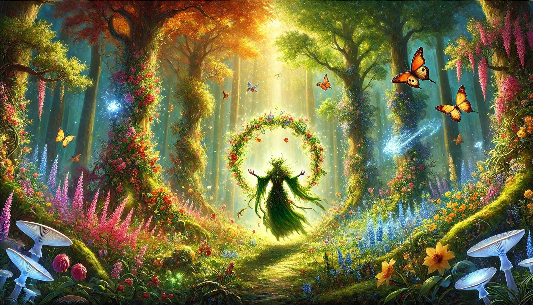 A digital painting of a vibrant fantasy scene depicting the life element in full bloom.