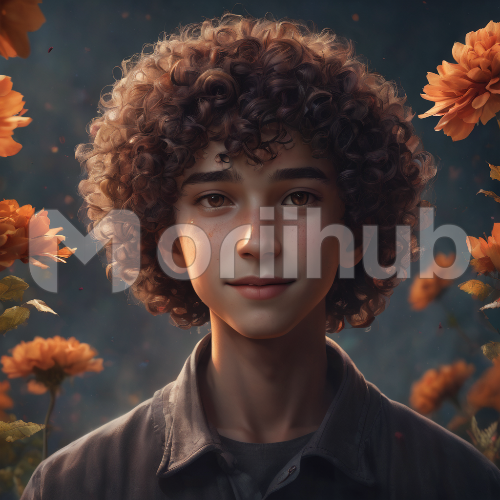 Amidst a backdrop of vibrant flowers, a teenage boy gazes pensively into the distance, his full hair tousled by the gentle breeze. His eyes reflect a mix of curiosity and contemplation as he stands amidst the natural beauty surrounding him. Behind him, colorful blooms add to the picturesque scene, framing the boy with their radiant hues. In this moment of quiet reflection, the boy embraces the serenity and beauty of the world around him.