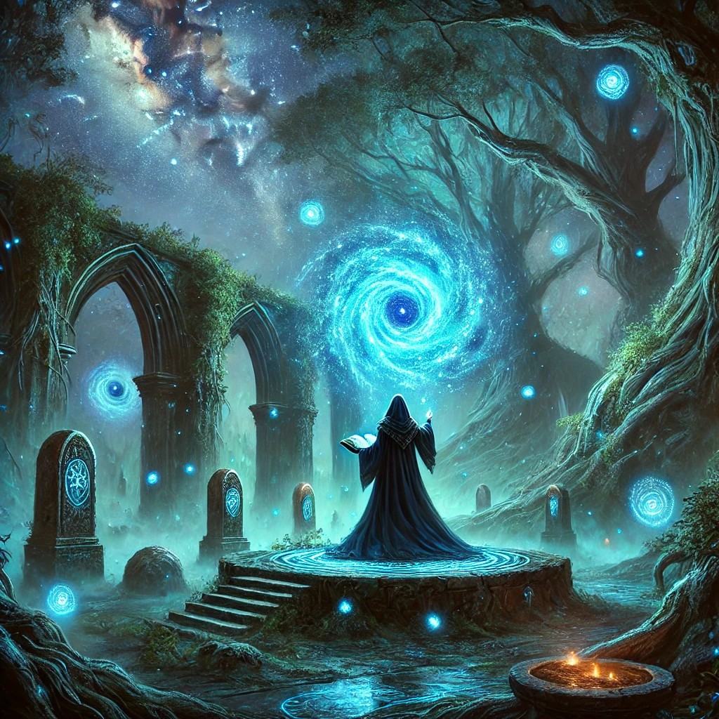 The image portrays an enchanted forest bathed in an ethereal blue mist, where towering, twisted trees glow with bioluminescent light. At the heart of the scene, a cloaked sorcerer stands on a floating stone platform, holding an ancient grimoire that radiates a mystical aura. The sorcerer is casting a powerful spell, with luminous tendrils of magic swirling around them, illuminating the surroundings with a spectral glow.
