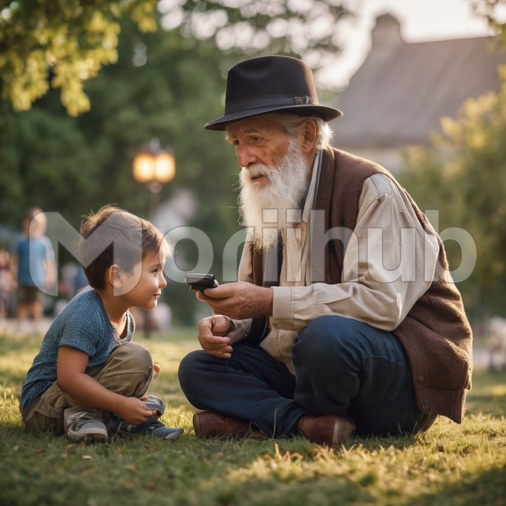 Amid the vibrant park, a wise grandpa sits cross-legged, his trusted hat perched jauntily on his head, engaged in a heartwarming conversation with his grandson. Their bond, evident in their animated exchange, transcends generations. People mill about, but in this tranquil moment, the world narrows to the stories shared between an elder and his eager young companion. Love and wisdom converge, creating a timeless tableau of intergenerational connection amidst the bustling park.