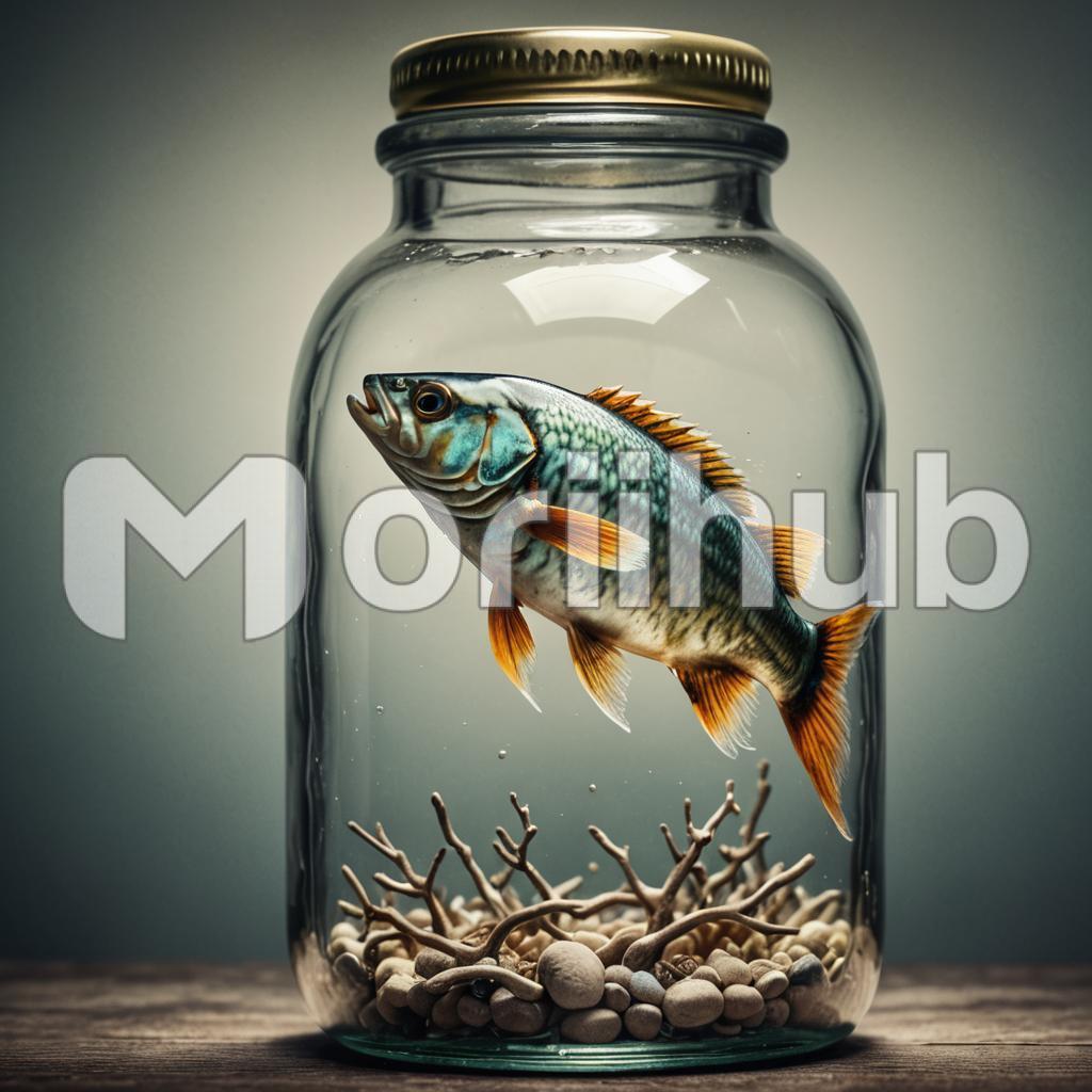 A lone fish swims gracefully in its glass confines, its iridescent scales catching the light. Within the small world of the bottle, it glides with effortless elegance, a solitary sentinel of aquatic beauty. Its movements, though confined, exude a sense of freedom and tranquility, captivating all who gaze upon its mesmerizing dance.