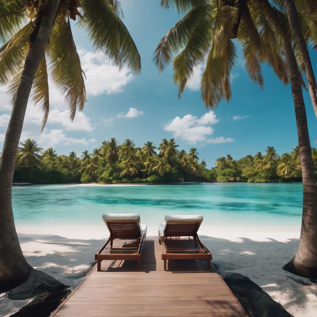 Beneath the soothing shade of swaying palm trees, two inviting reclining chairs beckon relaxation seekers. Positioned strategically, they offer an unhindered view of the expansive ocean ahead. The gentle rustle of leaves mingles with the rhythmic sounds of the waves, creating a serene ambiance. On the other side, lush greenery completes the tranquil setting, providing a harmonious blend of nature’s elements for those seeking repose in this idyllic coastal oasis.