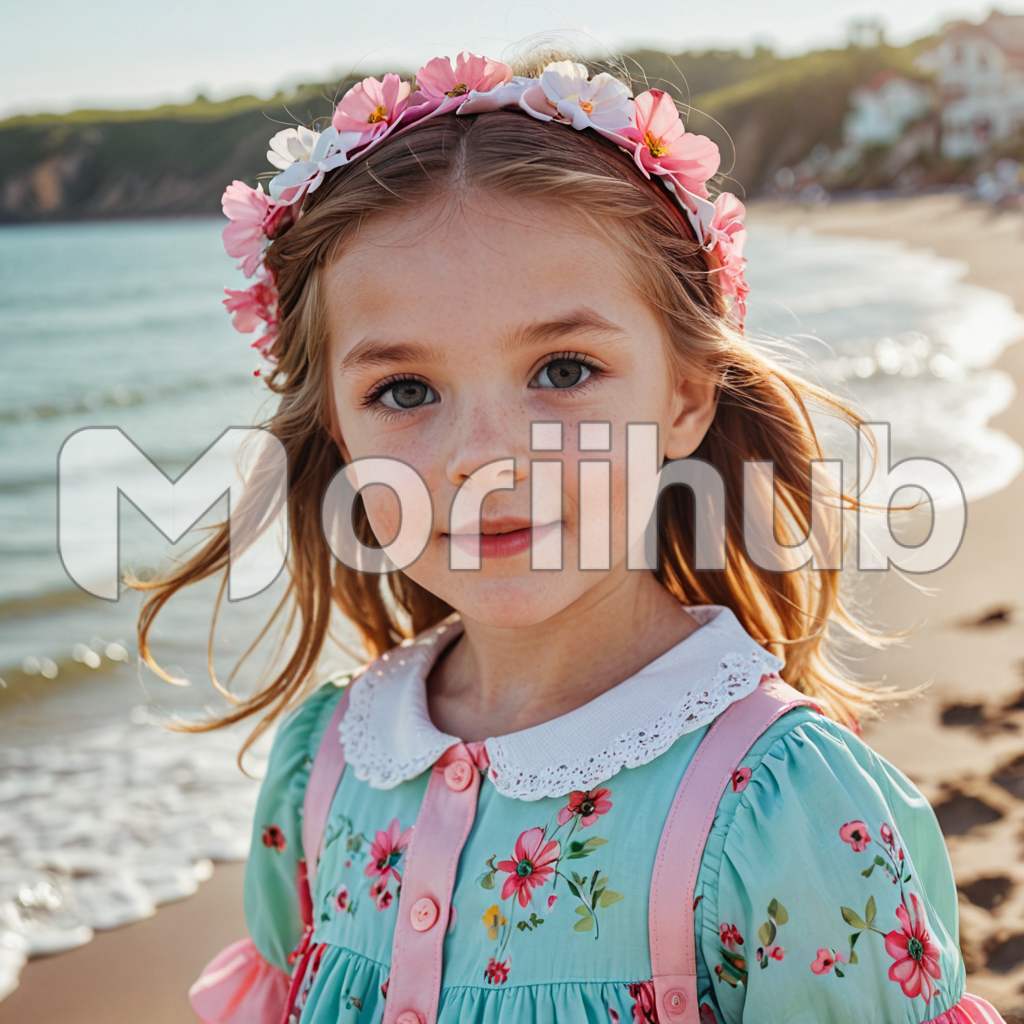 At the beach, a cute little girl skips along the shoreline, her floral print dress fluttering in the breeze like petals on the wind. A flower laurel rests delicately upon her hair, echoing the vibrant blooms that dot the sandy landscape. With each step, she leaves a trail of tiny footprints in the soft sand. In this idyllic scene, she embodies the essence of youthful joy and innocence, a radiant flower blooming amidst the sun-kissed serenity of the seaside.
