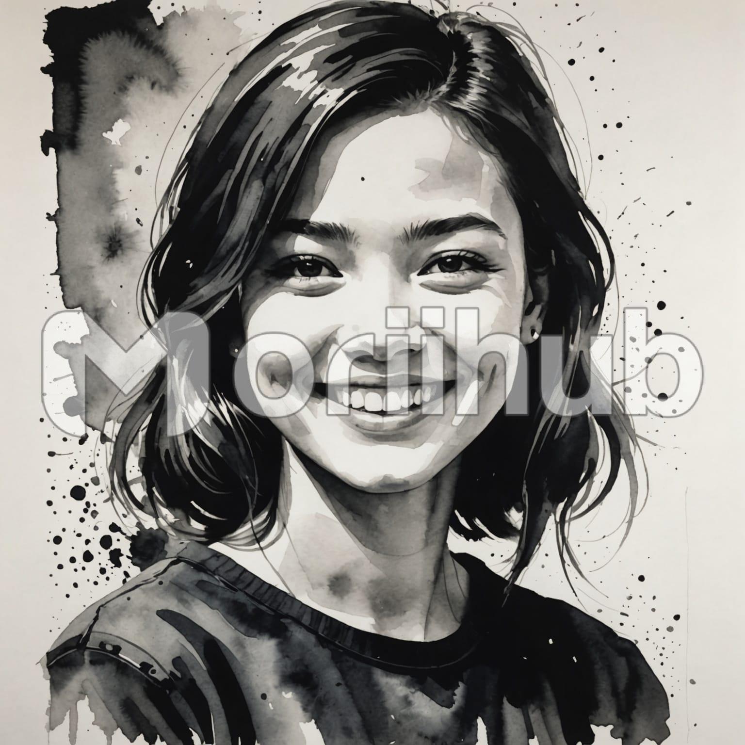 A drawing captures a girl smiling, her expression radiating joy and warmth. Her eyes twinkle with delight, reflecting a sense of happiness that is infectious. The artist has skillfully outlined her features, emphasizing the gentle curve of her lips and the sparkle in her eyes. Soft lines depict her hair, which flows freely, adding a sense of movement to the composition. The background is simple, allowing her smile to take center stage. This artwork evokes a feeling of cheerfulness, celebrating the beauty of a genuine, carefree moment in a girl’s life.