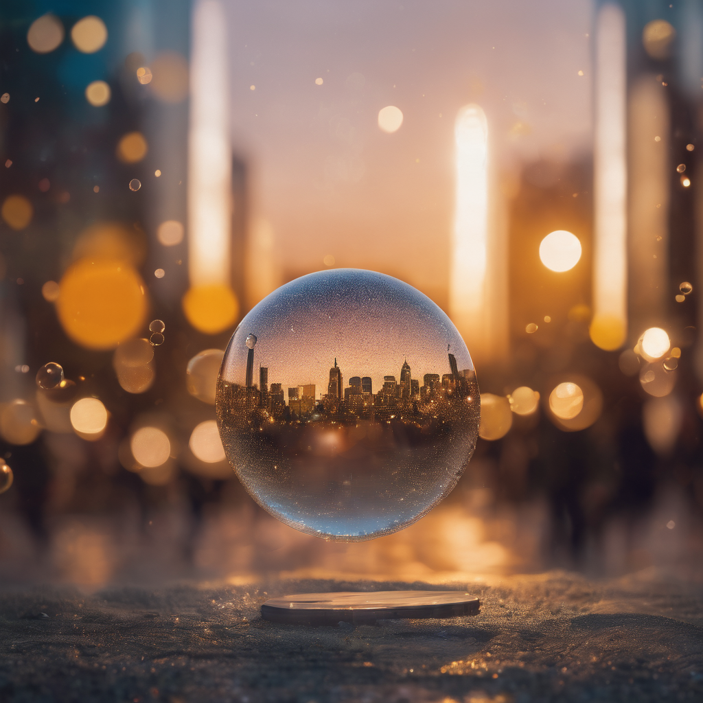 Within a tiny realm, a miniature cityscape unfolds, its buildings crafted with meticulous detail. Amidst this Lilliputian metropolis, a solitary bubble hovers, casting iridescent reflections on the diminutive streets below. Like a transient visitor from another world, it adds an ethereal touch to the scene, reminding onlookers of the fragility and beauty of the world around them, even in its smallest forms. In this miniature city, imagination reigns supreme, inviting exploration and wonder.