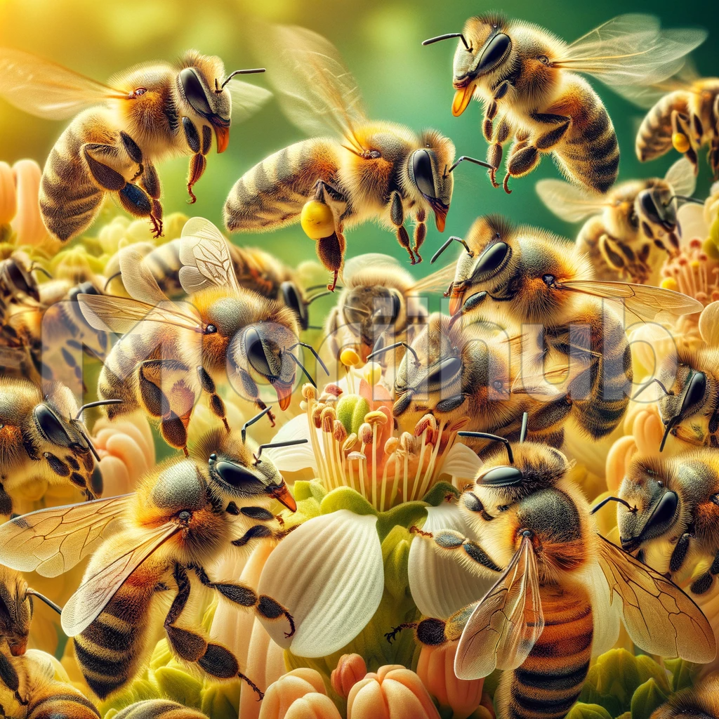 In this captivating close-up, a group of bees reveals the intricate wonders of their existence. Each bee is a marvel of nature, with delicate wings that shimmer in the sunlight as they hover in the air, their segmented bodies adorned with fine hairs and vibrant patterns. Some diligently collect pollen while others are in a state of perpetual motion. It’s a mesmerizing glimpse into the world of these remarkable pollinators, highlighting their essential role in the ecosystem.