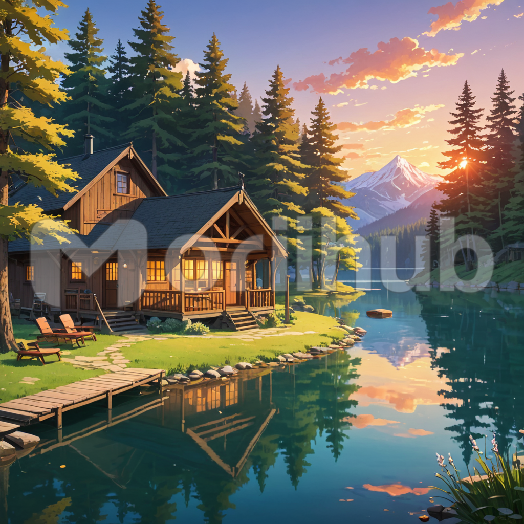 Nestled by the tranquil lake, a cozy cabin glows warmly as lights flicker within, casting a soft radiance onto the rippling water. The cabin’s rustic charm is mirrored in the serene surface of the lake, reflecting its wooden facade and the sparse clouds drifting lazily overhead. As the sun dips below the horizon, hues of orange and pink paint the sky, casting a warm glow over the tranquil scene. In this peaceful haven, amidst nature’s embrace, time seems to stand still, enveloped in the quiet beauty of the sunset-lit lake.