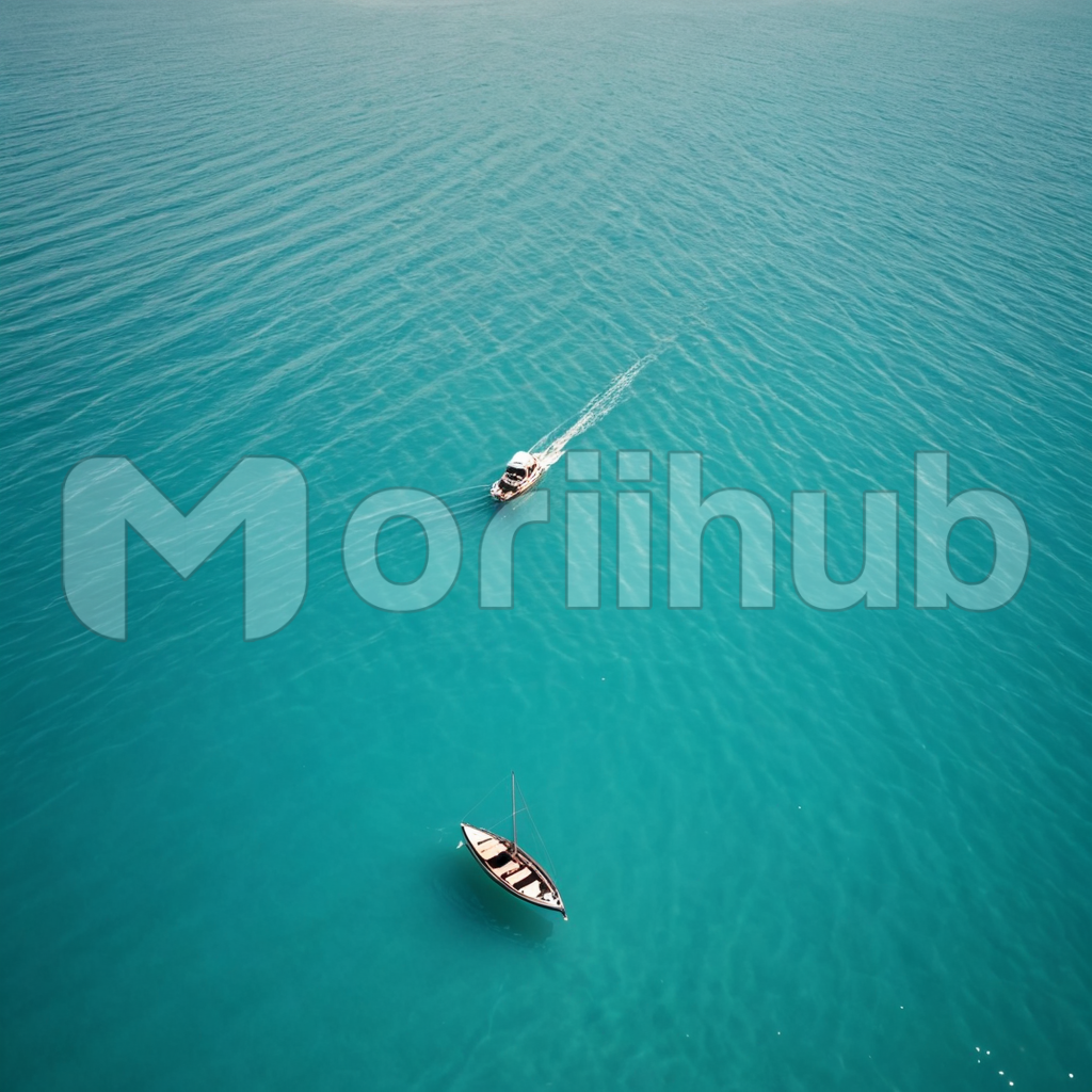 From above, the vast ocean spreads endlessly, its surface calm and unruffled. A lone canoe floats serenely, its occupant navigating the tranquil waters below. In the distance, a boat speeds alone, its wake cutting a straight path through the glassy surface. In this aerial perspective, the ocean appears as a serene expanse, a canvas of stillness upon which these solitary vessels journey, amidst the peaceful embrace of the endless sea.