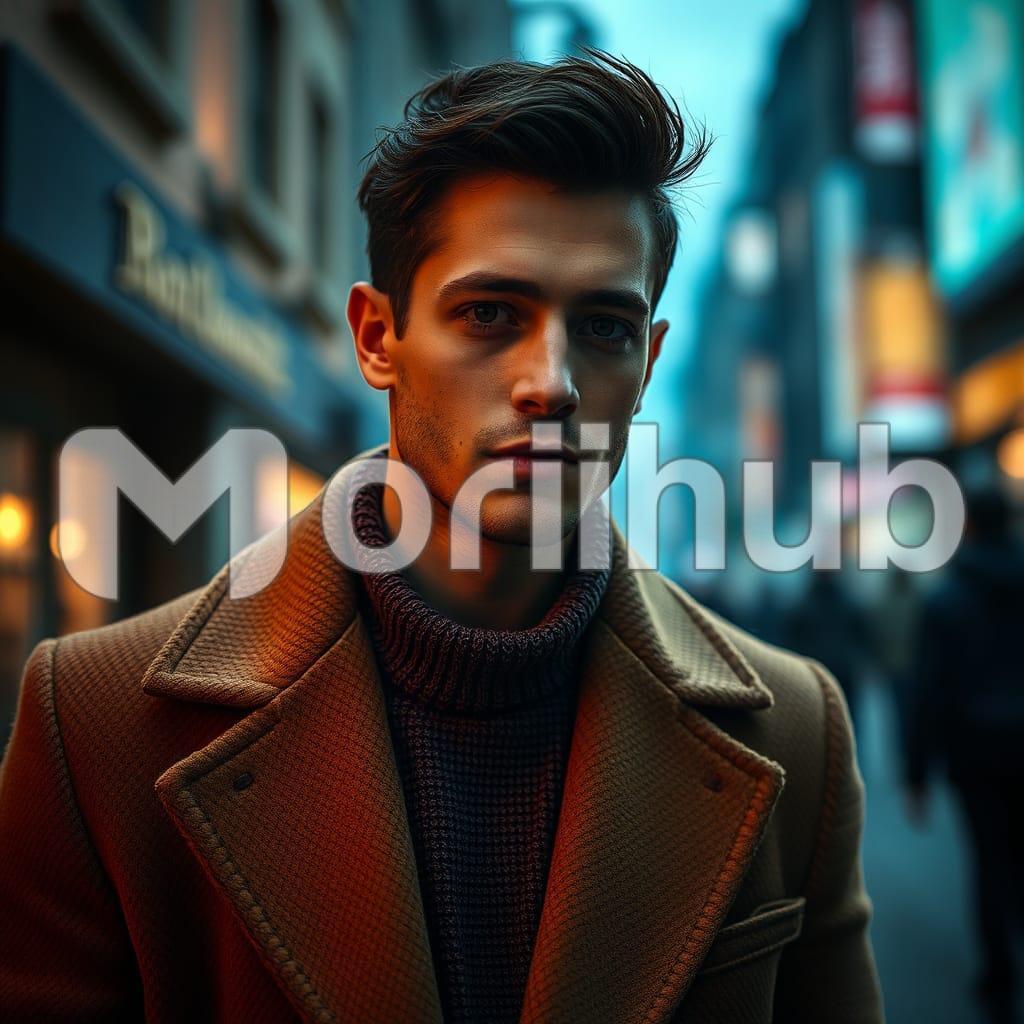 A calm, confident guy takes center stage at a fashion style showcase, effortlessly presenting modern, sleek outfits. His relaxed demeanor contrasts with the vibrant energy of the event, exuding quiet confidence.