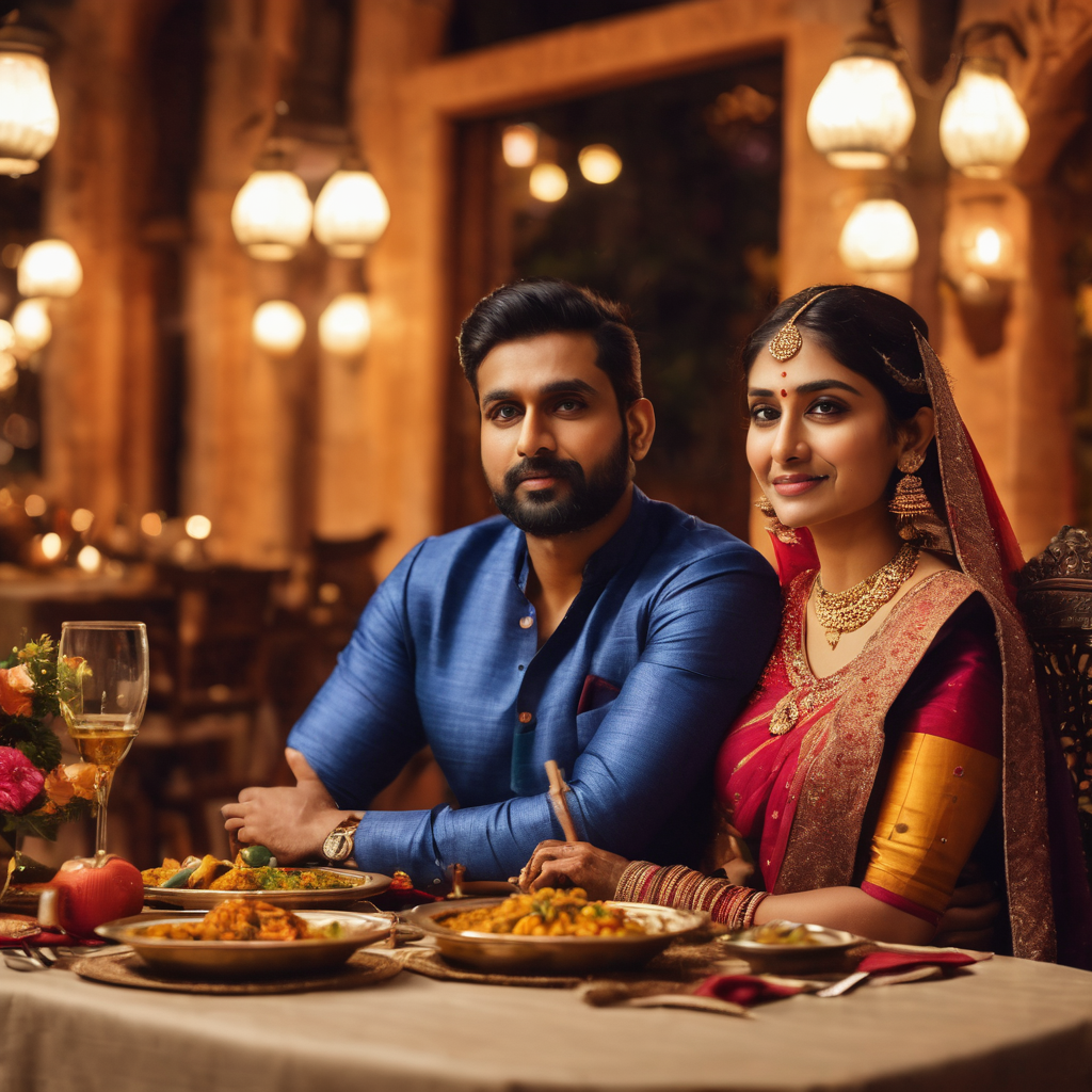 In the warm ambiance of the dinner date, the vibrant Indian couple strikes a pose for the camera, exuding a captivating blend of tradition and modernity. Her intricately embroidered saree glows in candlelight, while he dons a stylish ensemble. The joy in their eyes and the cultural fusion captured in that moment narrate a tale of love and celebration.