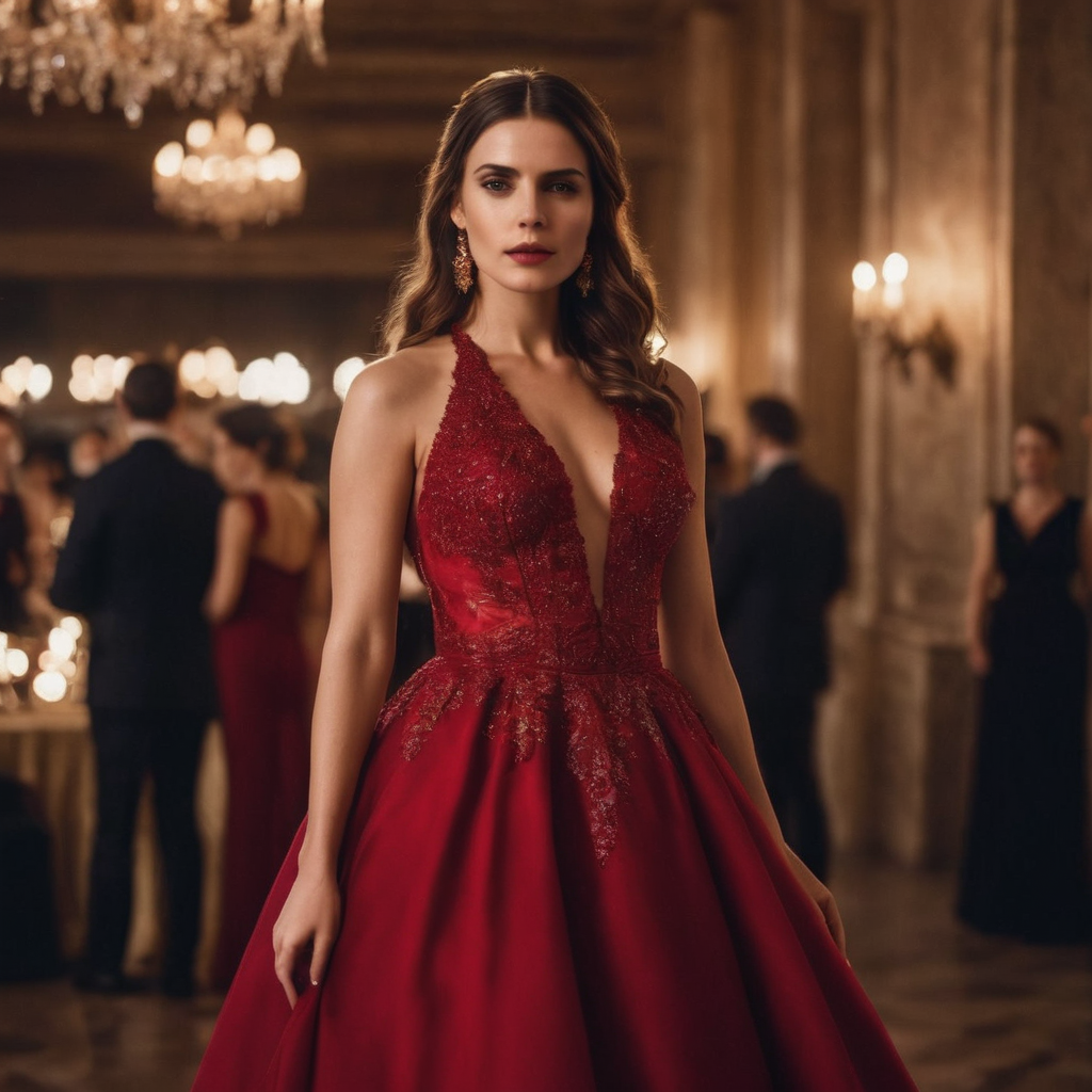 In the grand hall, a woman graces the scene in a breathtaking long gown, embodying timeless elegance. The fabric cascades gracefully, adorned with intricate details that catch the ambient light. Surrounding her, a diverse gathering of people adds a dynamic touch to the opulent ambiance. As she moves through the hall, the woman becomes a living masterpiece, a fusion of sophistication and allure, creating a captivating tableau within the lively social tapestry.