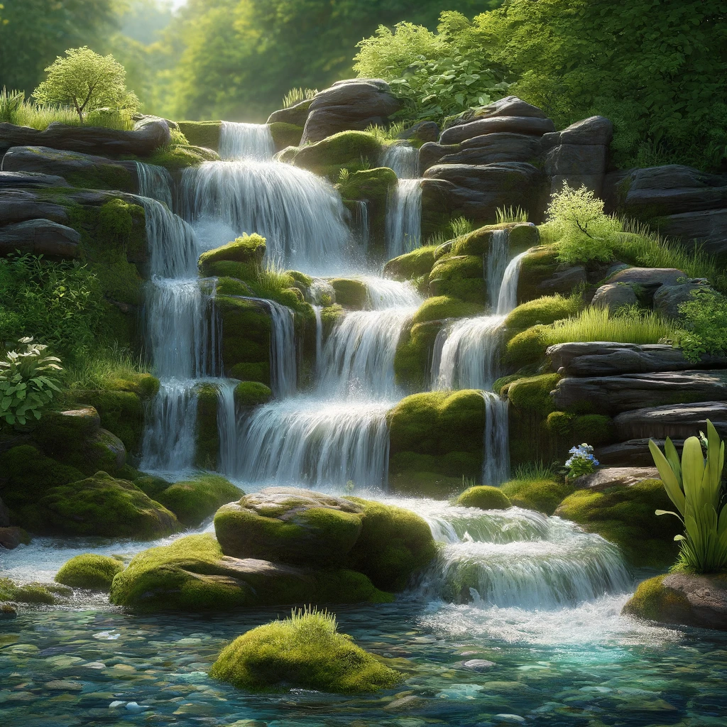 In this tranquil landscape, water meanders gracefully down a rock formation, creating a serene scene of natural beauty. The small waterfall cascades gently over smooth rocks, its clear waters shimmering in the sunlight. Surrounded by lush greenery, the soothing sound of flowing water adds to the peaceful ambiance of the setting.