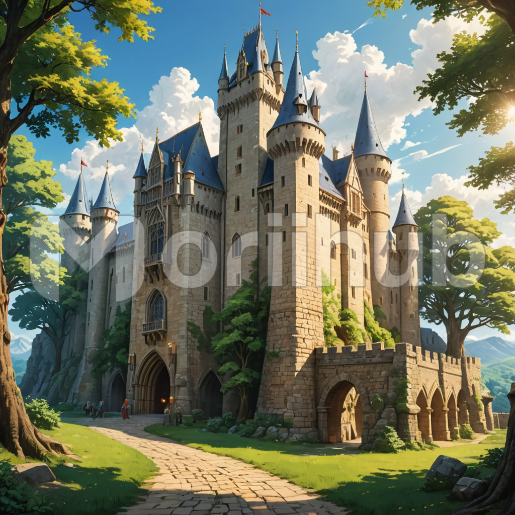 In the whimsical cartoon scene, a grand castle rises majestically against a backdrop of billowing clouds. Its towering spires and turrets exude an aura of timeless grandeur and mystique. Surrounding the castle, lush greenery flourishes in the corner, adding to the enchanting ambiance. Despite the cloudy skies, the castle stands as a beacon of strength and resilience, its presence a testament to the enduring allure of fairy tale magic and fantasy.