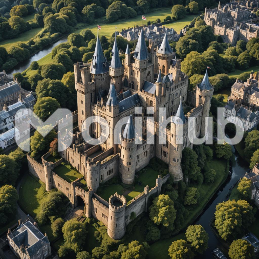 Nestled within a verdant oasis, a castle rises majestically amidst lush surroundings, its ancient walls adorned with ivy and moss. Towering trees provide a canopy of shade, while vibrant gardens bloom with a riot of colors. Serene ponds reflect the castle’s grandeur, completing the enchanting scene of natural beauty harmonizing with architectural splendor.
