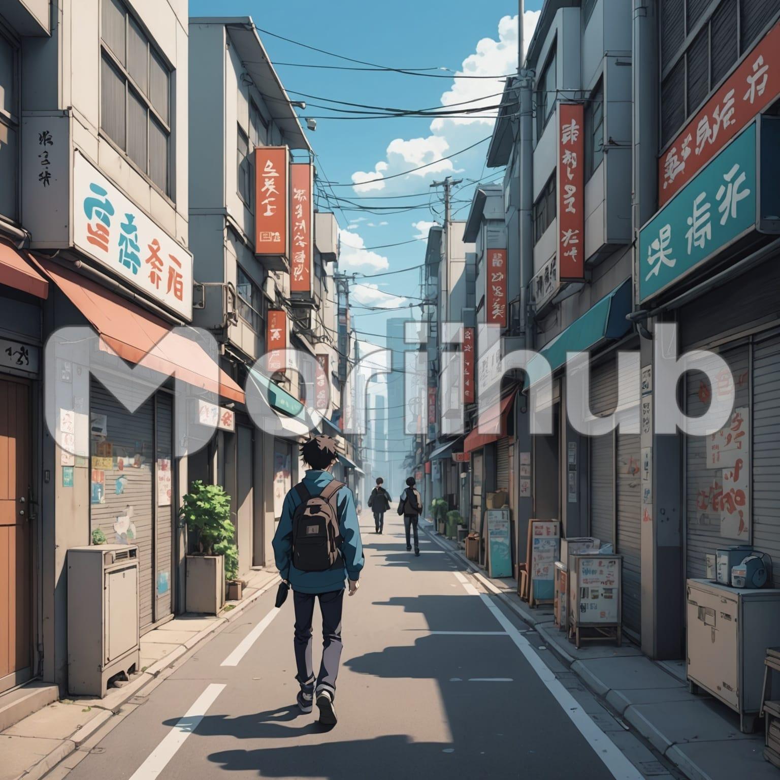The boy’s back is to us as he walks down the street, his small frame slightly swaying with each step. His tousled hair bounces gently. Ahead of him, two people walk, their pace steady. The boy’s pace is unhurried, and he occasionally glances at the scenery. The late afternoon light casts long shadows, creating a peaceful ambiance. This quiet moment captures the essence of a lazy summer day.