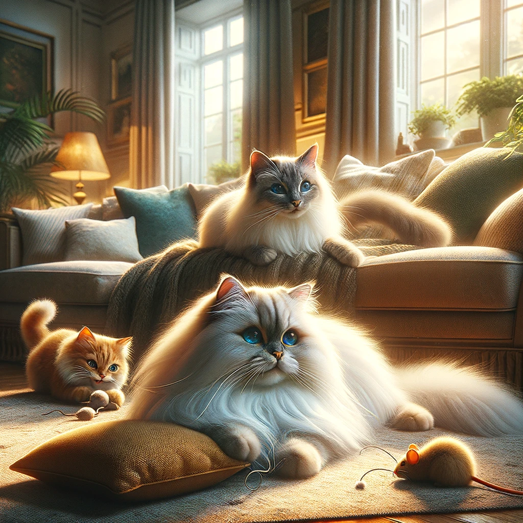 Picture a heartwarming tableau in a cozy living room, where three cats of different breeds bask in serene harmony. Among them, a fluffy Persian reclines regally, its long, luxurious fur cascading like silk. Together, they embody companionship and contentment, epitomizing the tranquil beauty of feline companionship.