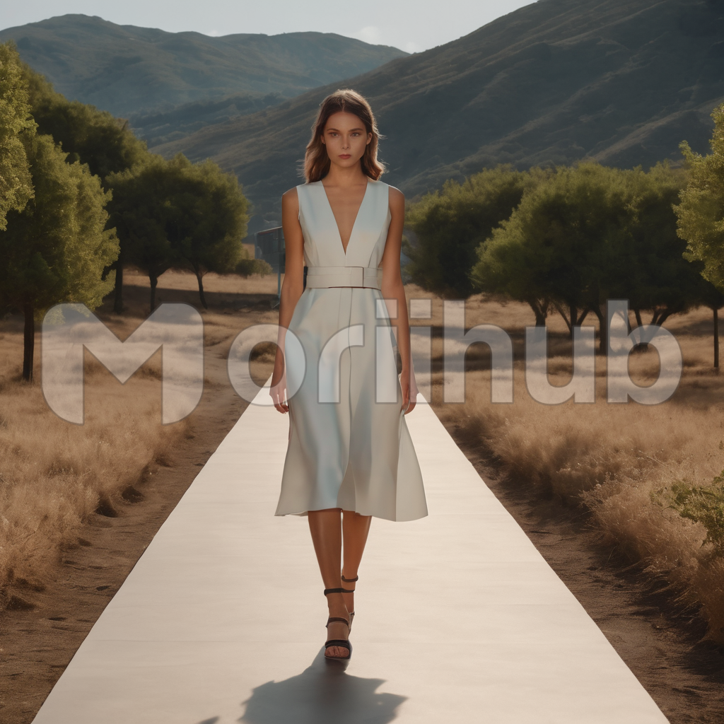 On the catwalk, a female model commands attention with every stride, embodying grace and confidence. Her presence is magnetic, as she navigates the runway with poise. The ensemble she wears, a masterpiece of haute couture, drapes elegantly, accentuating her figure. The catwalk transforms into a visual symphony of fashion, where her every step is a brushstroke in the canvas of style and sophistication.