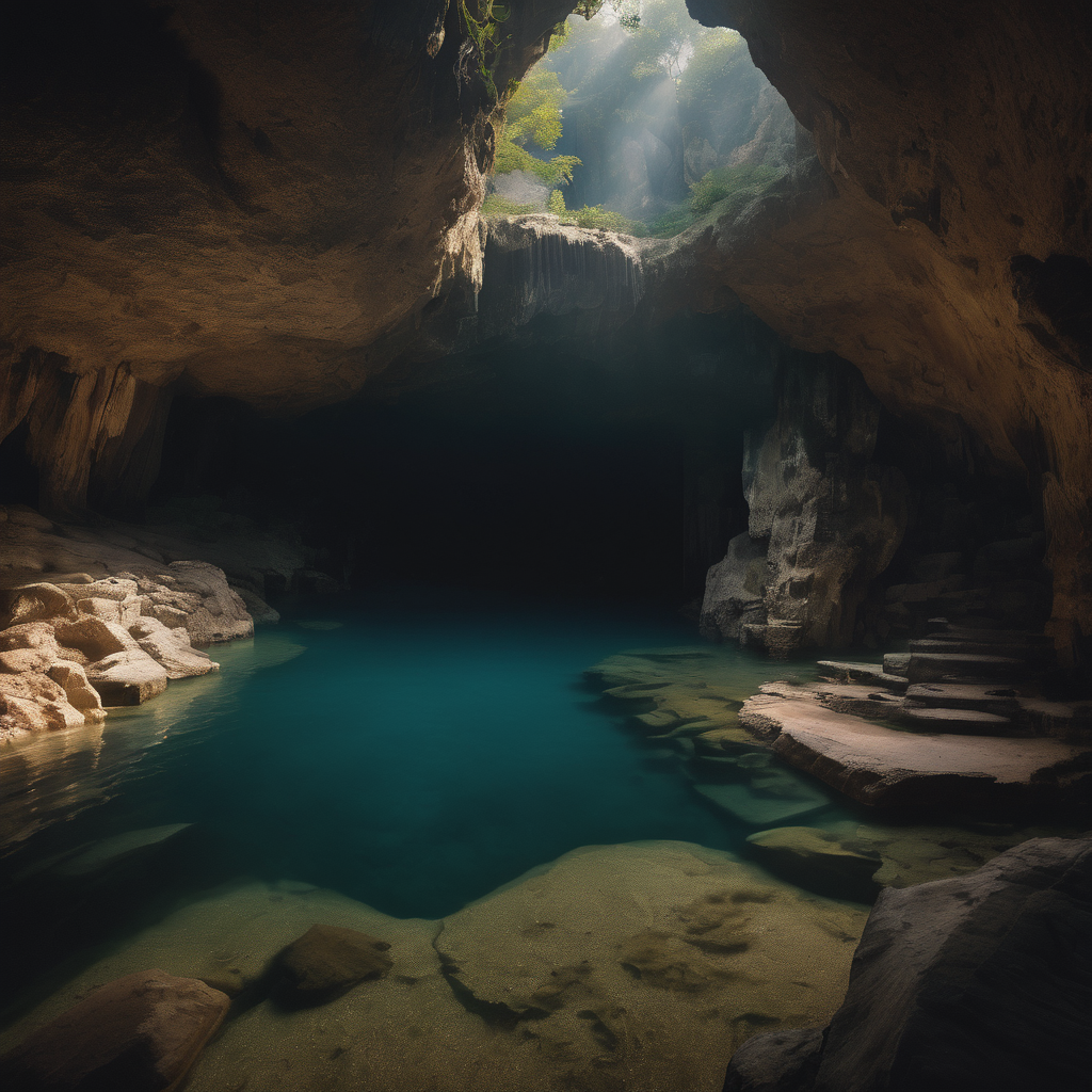Within the subterranean depths of a cavern, a tranquil river meanders gracefully, its waters reflecting the dim glow of stalactites overhead. Towering rocks line the riverbanks, their ancient forms weathered by time’s patient embrace. At the cave’s end, a luminous opening reveals the surface world, casting a radiant beam of daylight into the darkness below. In this hidden sanctuary, nature’s raw beauty harmonizes with the ancient whispers of the earth.