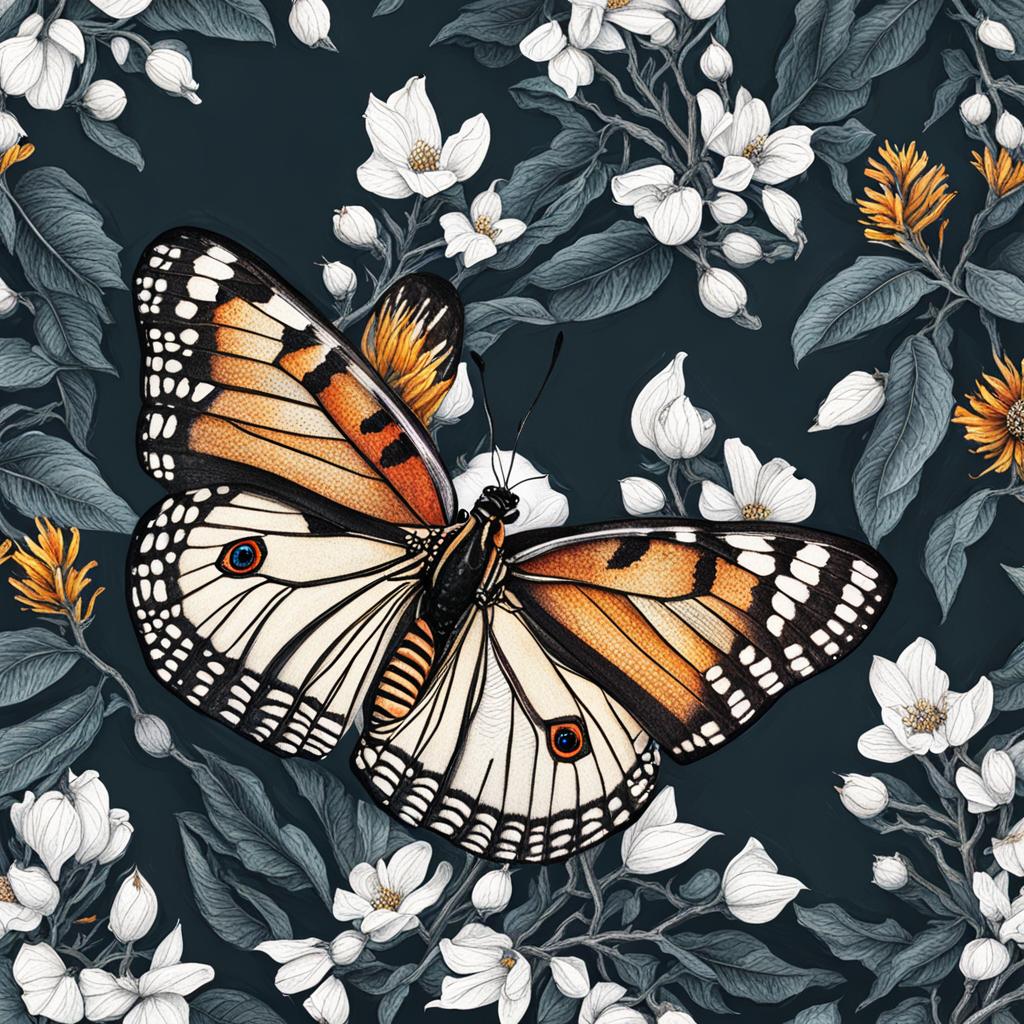 Against a velvety black canvas, a mesmerizing painting unfolds—a delicate butterfly, resplendent in vivid hues, takes center stage. Its wings, a symphony of color, capture the essence of ephemeral beauty. Surrounding it, a swirl of petals in varying shades enhances the enchantment, creating an ethereal aura. The stark contrast against the dark backdrop amplifies the vibrancy of the butterfly, rendering the scene a captivating dance of vivid form on an inky stage—a visual ode to the fleeting grace of nature.