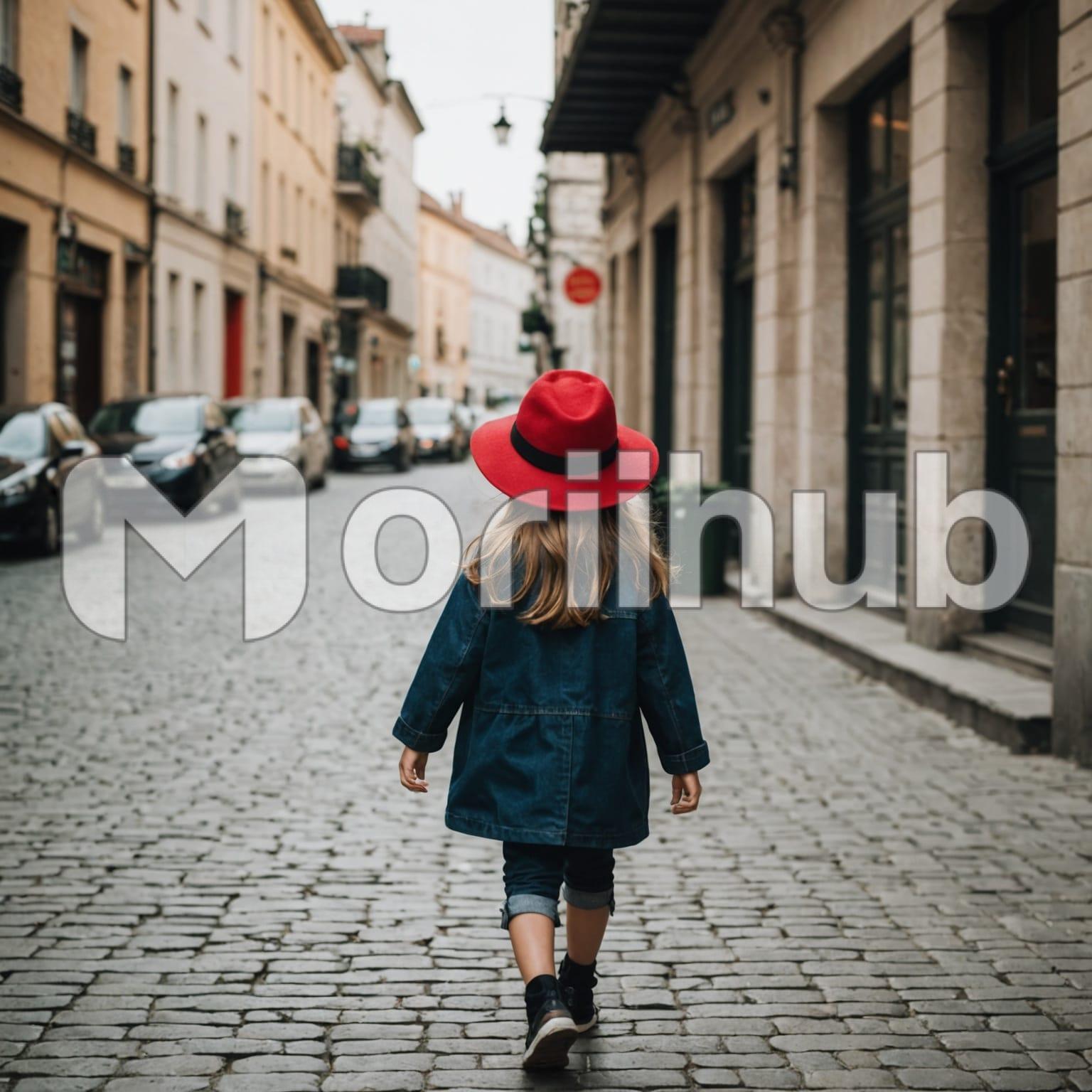 A little girl, her back to the viewer, walks confidently along the bustling street, her small frame adorned with a charming hat. Her silhouette is defined against the urban backdrop, where people and buildings blur into the distance. The hat adds a touch of whimsy to her appearance, contrasting with her playful stride. As she moves forward, her posture exudes a sense of curiosity and wonder, encapsulating the innocence and adventurous spirit of childhood in the midst of a vibrant cityscape.