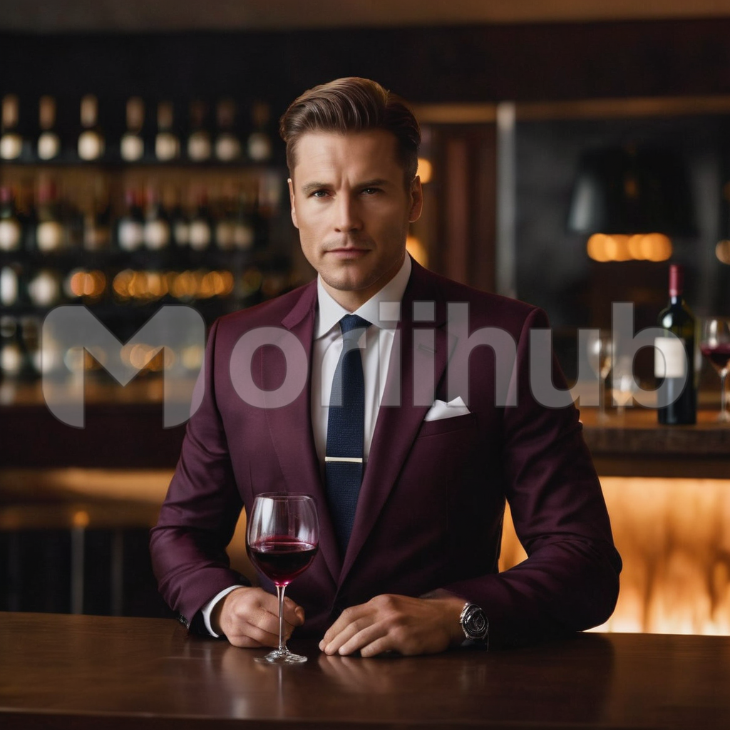 In the refined ambiance of a bar, a gentleman stands with tailored elegance. His hands rest on the counter, conveying confidence and sophistication. Clad in a meticulously crafted suit, he holds a glass of wine, its rich hue reflecting the bar’s warm lighting. The atmosphere exudes an air of leisure and refinement, encapsulating the man’s poised demeanor and the timeless allure of savoring a moment in style.