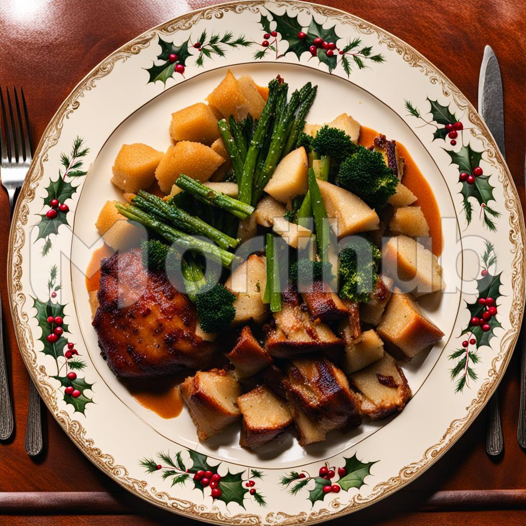 Upon the festive plate, a symphony of Christmas flavors unfolds. A succulent roast, adorned with a glistening glaze, steals the spotlight. Surrounding it, velvety mashed potatoes nestle beside vibrant green beans, while jewel-like cranberry sauce adds a sweet-tart burst. The plate, a canvas of holiday hues, promises a delectable journey through the cherished tastes of Christmas.