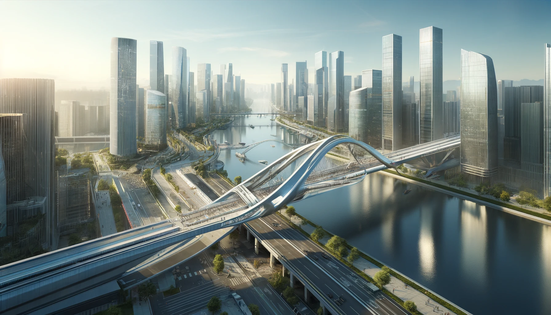 Spanning a wide river, a sleek bridge connects two modern cities pulsating with life. Glass and steel skyscrapers rise majestically, catching the sunlight and casting reflections that dance across the water’s surface. Amidst the hustle and bustle, the bridge stands as a symbol of connection, uniting communities and fostering progress.
