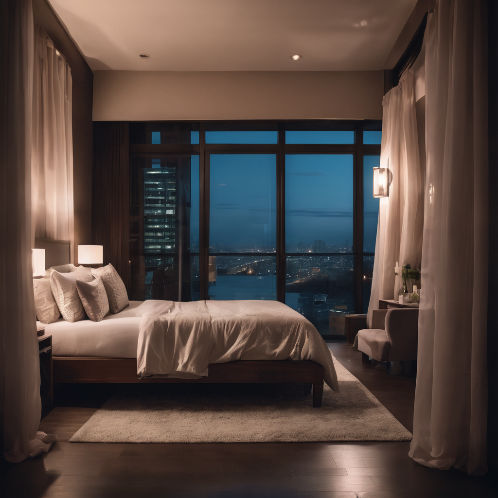 In a modern bedroom, a floor-to-ceiling window offers a panoramic view of the dark sky juxtaposed against the twinkling lights of the cityscape below. The contrast between the urban landscape and the vast expanse of the night sky creates a captivating tableau, blending the tranquility of the cosmos with the energy of the city. It’s a scene that invites contemplation and wonder, bridging the divide between urban life and the cosmic unknown.