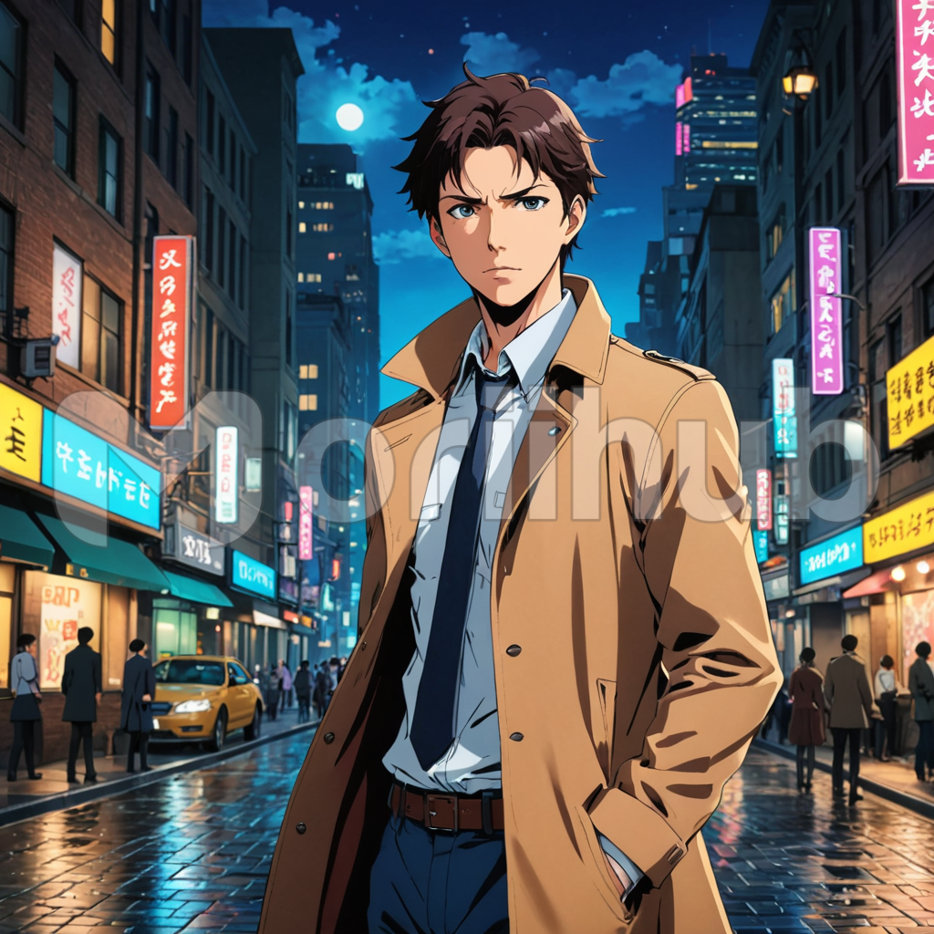 Amidst the urban labyrinth, a man in a detective’s overcoat stands with an aura of vigilance. His silhouette is outlined against the backdrop of neon-lit signs, hands nonchalantly tucked into his pockets. With a keen gaze, he surveys the scene before him, ever watchful for signs of intrigue or mystery. Despite the darkness, his presence exudes determination and resolve amidst the urban night.