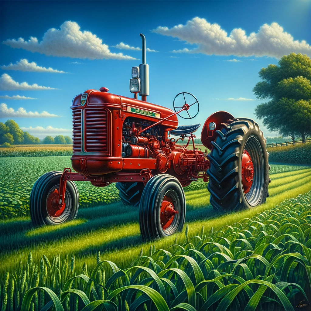 In the heart of a vibrant green expanse lies a scene of timeless agricultural charm. A classic red farm tractor, resolute against the backdrop of a cerulean sky, commands attention with its sturdy presence. Its massive wheels, meticulously detailed, stand as symbols of reliability and hard work, ready to till the earth under the radiant sun.