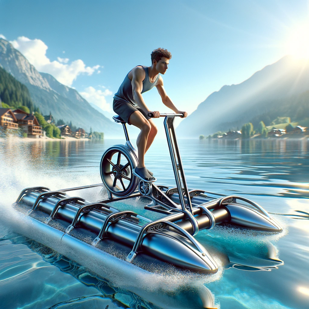 Amidst the serene expanse of a clear blue lake or tranquil sea, a modern adventure unfolds. A sleek water bike, crafted for speed and agility, glides effortlessly over the water’s surface. With its pontoons keeping balance, the rider embarks on an exhilarating journey, propelled by the thrill of exploration and the beauty of nature’s canvas.